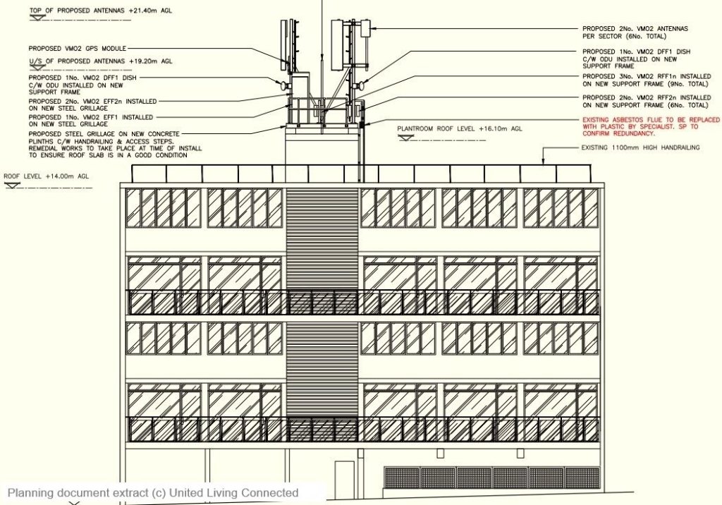 Antrim House’s new masts are being installed by Cornerstone, a large mobile infrastructure services company with over 20,000 sites that cover about half the country’s mobile customers. They’ll include six antennas and two small 30cm dishes, and three rooftop equipment cabinets – essentially exactly what is currently on the roof of the Devas Club. Unlike at the Devas Club where the antennas tend to be on the corners of the building, at Antrim House they will be clustered near the middle of the roof, where there is better access and something sufficiently firm to attach them to; this does have the side effect of making the overall mast a bit higher than it the ones it is replacing at the Devas building (to reach round the building roof) but also probably less visible from the ground.