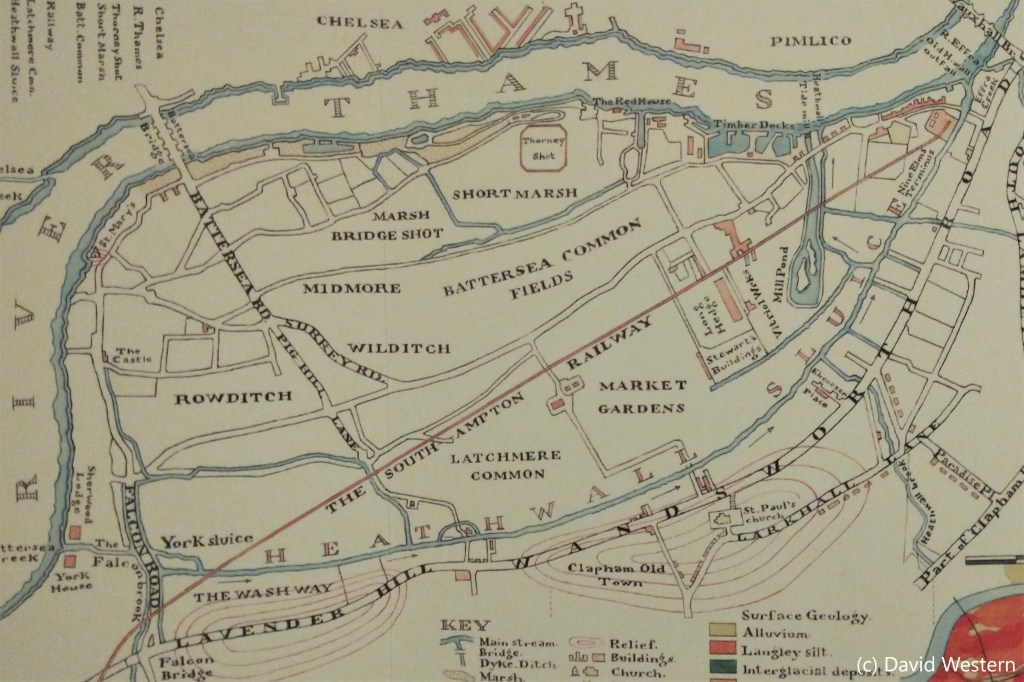The raised embankments at the side of the Thames are what allowed Battersea to move from being a low-lying swamp, to being a rich agricultural area famed for exotic crops such as melon and asparagus, and then to go on to be swept up in the urbanisation of London. But the land was below the level of the river at high tide, and the water that ended up in Battersea still had to go somewhere! The Heathwall was the river that drained all this low-lying land, and where it met the Thames, a sluice gate was opened at low tide so it could empty to the Thames, and then closed as the Thames rose above the level of the land. As Jon Newman explains, there were disastrous situations when these sluice gates weren’t closed in time! Jon’s map below shows the Heathwall running from Falcon Road, roughly parallel to Lavender Hill and Wandsworth Road all the way to Vauxhall.