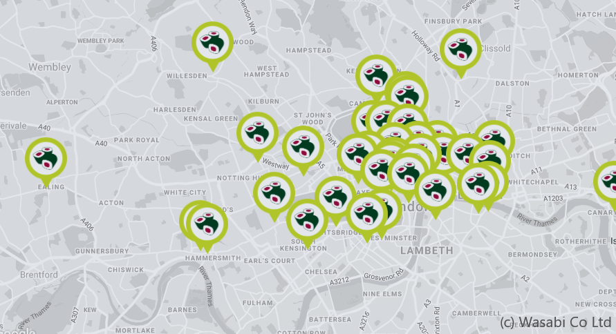 Wasabi, seller of takeaway sushi and bento, fall in to the same category of business. However they were maybe a little later to try out trade in the inner suburbs: their current London locations have a distinct City of London focus, with a slightly less dense coverage around the West End – and are not what you really want at a time when the town centre has lost trade to the suburbs!