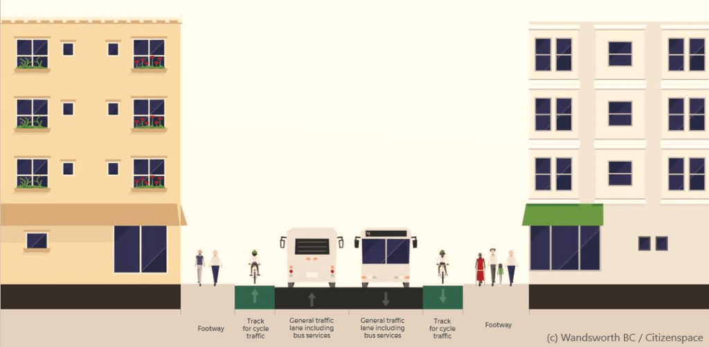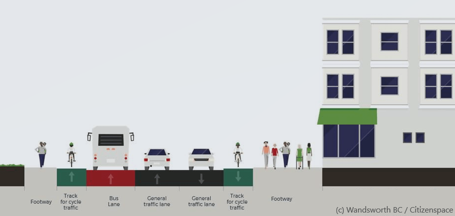 The high level plan is still the same, to create a separate cycle lane at a height half way between the level of the pavement and the road. The junction with Battersea Park Road will need some careful work as it’s also a busy cycle route, with lot of pedestrians (and probably more in the near future given the amount of recent development and the forthcoming opening of a Zone 1 tube station) and not currently especially bike-friendly.
