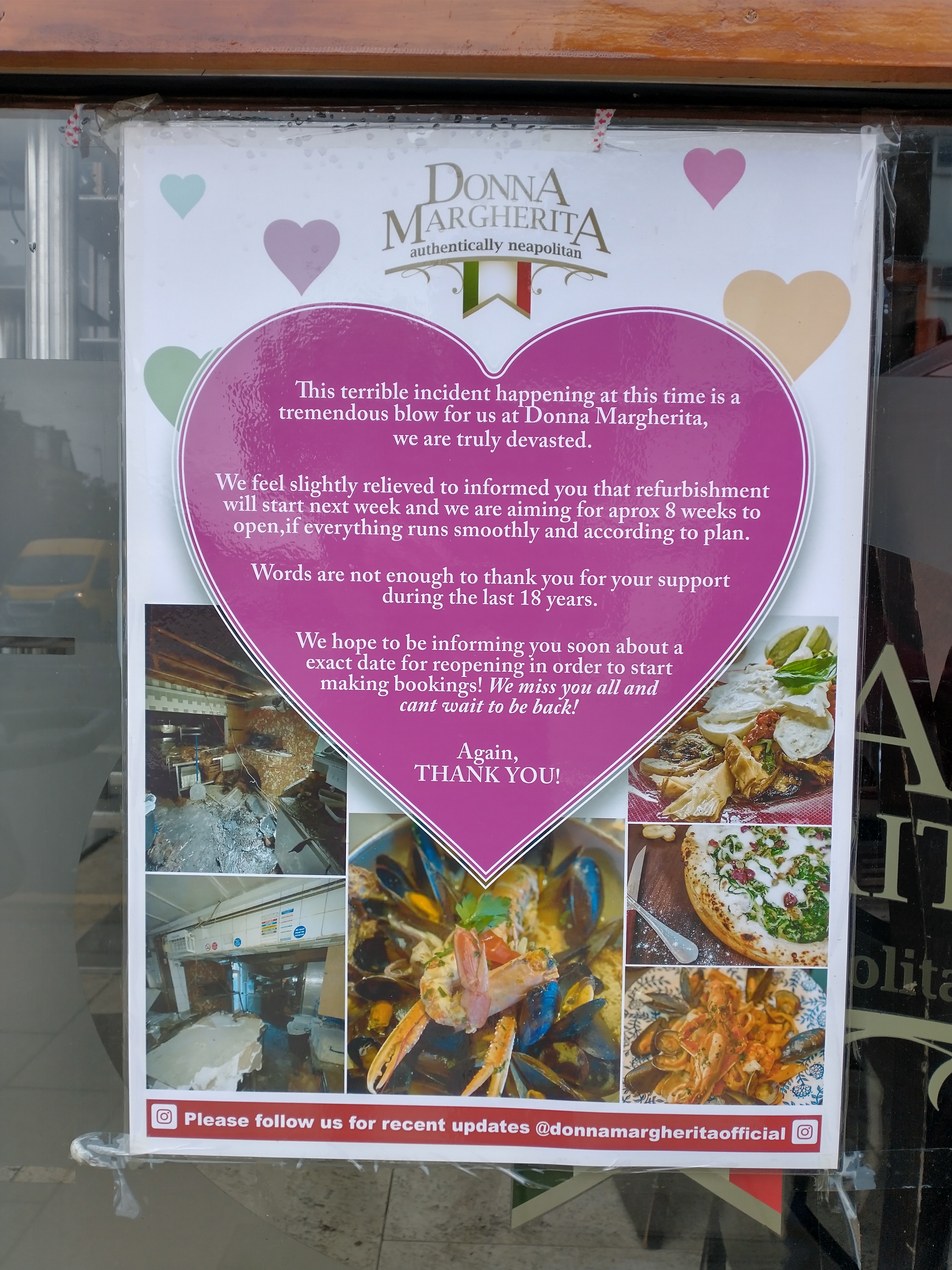 It’s not been all good news: one of our longest standing restaurants, Donna Margherita, developed an Italian produce shop in the first lockdown, selling products as well as a takeaway / delivery offer – but had the terrible luck of a rather severe kitchen fire a few weeks back. The fire was controlled and fortunately we understand there were no injuries – but it means there’s a lot of work to do to get everything back in to condition, so they’ll be closed for a short while. We’ll be spreading the word as soon as they are back.