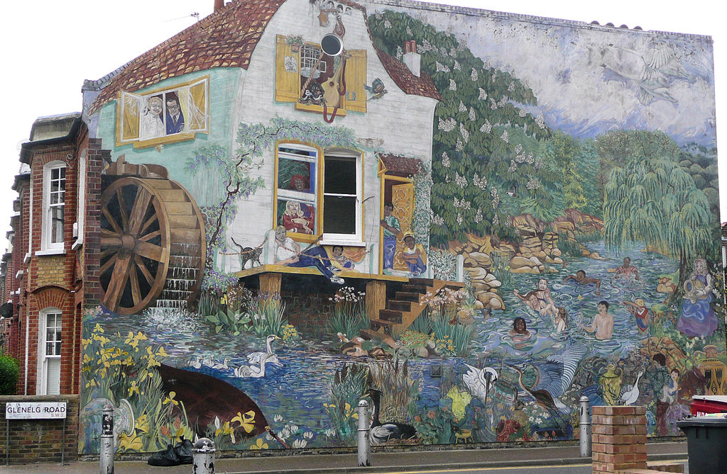 London is perfect territory for murals. Wartime destruction, postwar estate development, and the occasional over-ambitious road project all conspired to leave a lot of Victorian terraces sliced in two, with large messy-looking blank walls – occasionally with the odd chimney or fireplace alcove remaining in place. And in the 1980s and 1990s, several talented artists duly stepped in to the breach, equipped with skill, vision and a large amount of paint, and created what became a rich south London tradition of murals, surprisingly many of which have a nature theme. The biggest concentration of murals is in and around Brixton – but we have several of our own here in Battersea, which we’ll be writing a short series of posts on.