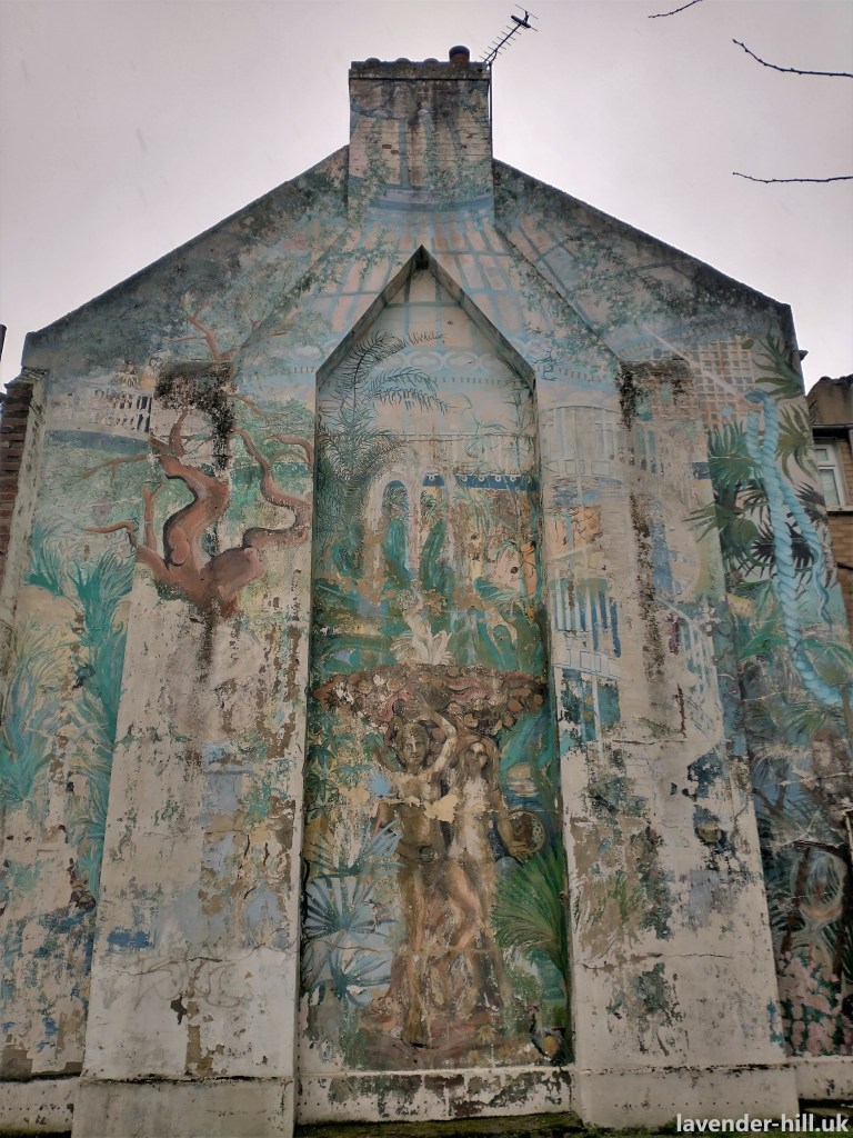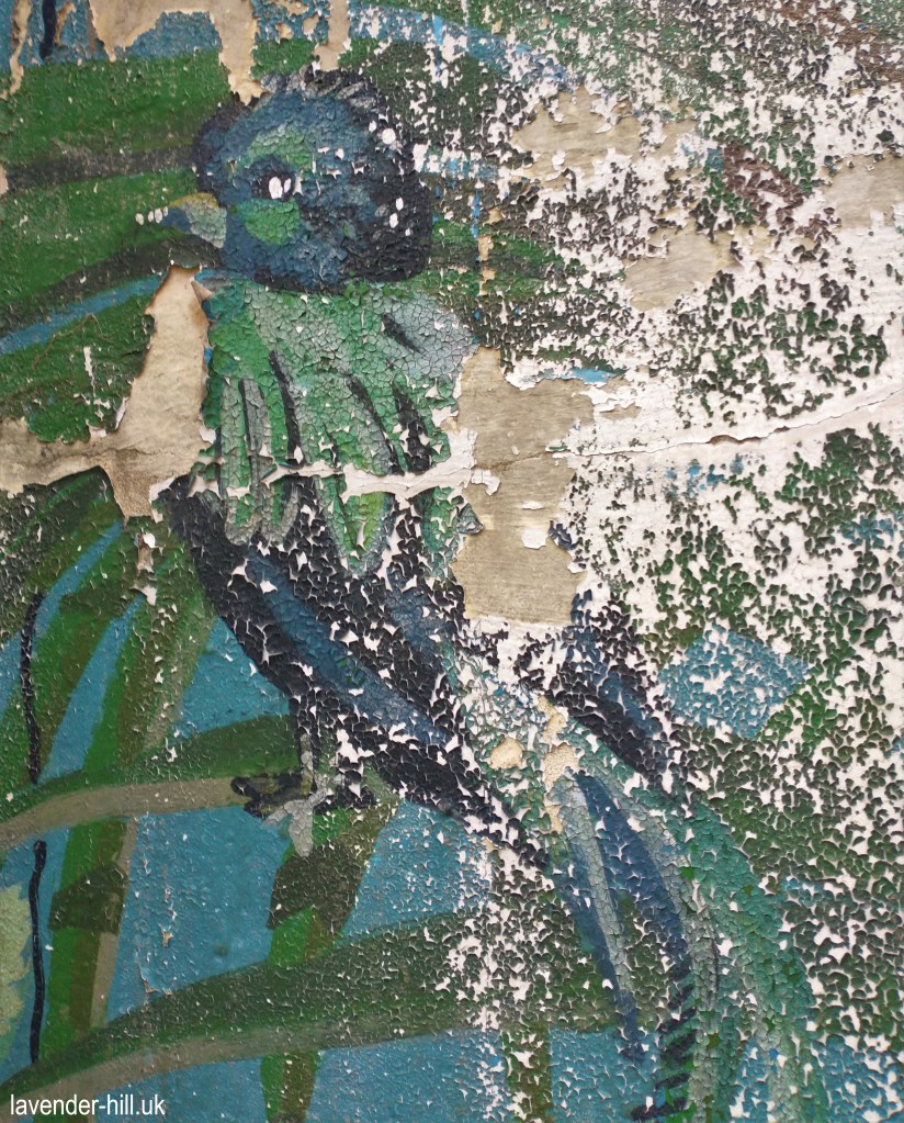 Sadly it’s not had the easiest of rides over the years – as the rich colours have become detached from the undercoat (which seems to be a layer of standard emulsion house paint), and some rainwater damage is visible at the top as well – meaning the overall picture has become hard to piece together from a distance. But looking more closely there’s still plenty of charm and character, as our photos show – and which give a feel for just how special this mural was when it was first painted. It’s based on the big greenhouse in Kew Gardens – hence the abundance of tropical plants and exotic wildlife, as well as the spiral staircase leading to the upper walkway – with an Adam and Eve sculpture at the centre.