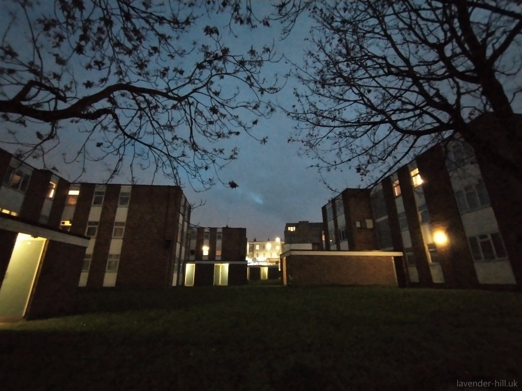 Dusk falls over the quiet green space between the flats on Ashley Crescent, with a glimpse of the brighter lights of Lavender Hill in the background. One of many estates of similar design, the architect of Ashley Crescent was L. Phillips, Borough architect for Wandsworth in the late 1970s (who also designed the Northcote Library). This was a simple design that worked pretty well, which explains why there’s another block of much the same design at the junction of Stormont Road and Gowrie Road, as well as clusters of similar flats in Halston Close off Northcote Road, and in Hanson Close and Hunter Close in Balham.