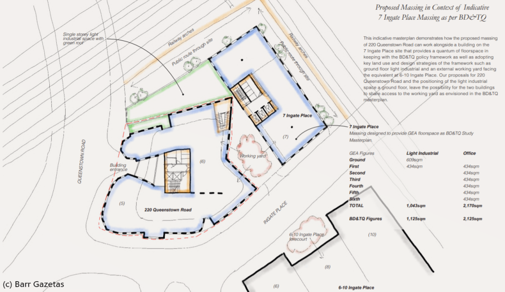 There’s a more to come too – as all these buildings are in the Battersea Design & Technology Quarter, a creative and technology hub which Wandsworth Council have designated that covers the whole of this area, essentially extending and increasing the density of the existing industrial area to accommodate more employment, in particular creative design and technology businesses that are likely to cluster around the power station and Nine Elms. As an example, the plans foresee a further six-storey building to be built at 7 Ingate Place (between Ingate Works and the railway), shown as a blue rectangle in the image below.
