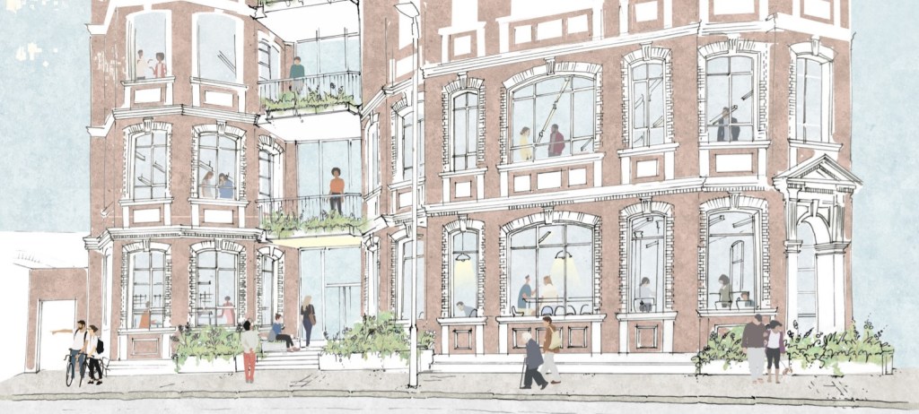 Another key change will be the entrance – which will move to the space between the two buildings, with a double height reception, with balconies above it, as shown below. This will make the building a lot more approachable, and is a clever way of linking the two buildings as a modern office without losing sight of their history as two structures. The target audience for the new office is small to medium size businesses, probably mostly in the technology, media and telecommunications sectors.