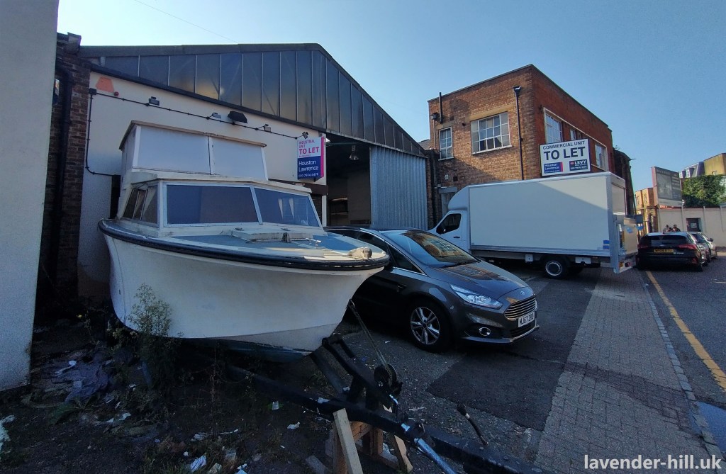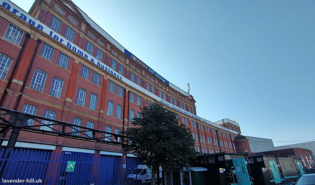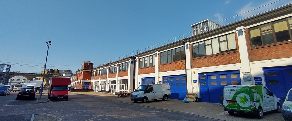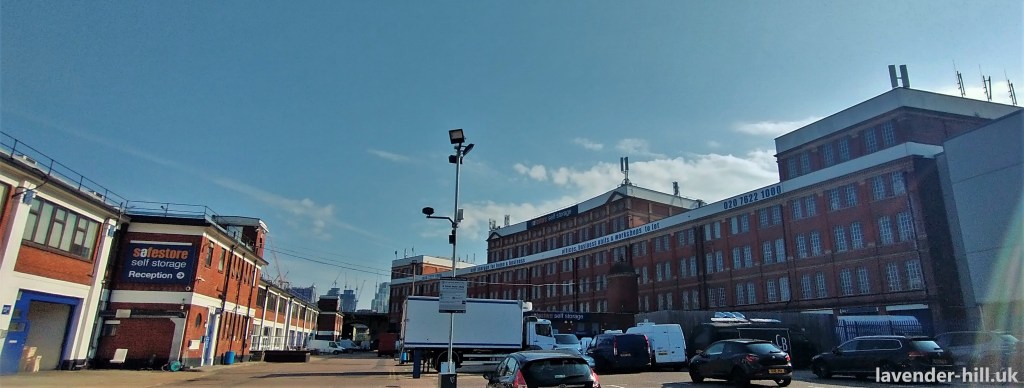 But these are all a bit of a sideshow compared to what lies further along Ingate Place. Because as anyone who’s taken a train past Queenstown Road knows, the showstopper is the huge curvy Safestore self storage building shown below. Originally built as a furniture depository by high-end furnishers Hamptons, it has an interesting past – so interesting that we’ll be writing a separate post all about the building in the near future! Its present is useful but not particularly exciting – being mainly a large self-storage base, and (in assorted sheds in the car park) a hub for a variety of delivery businesses and dark kitchens.
