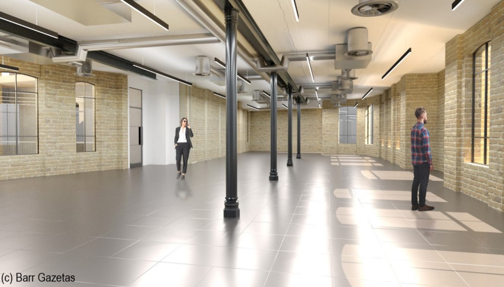 There will be a restoration of the heritage exterior parts of the buildings, as well as a comprehensive refit of the interior of the existing buildings, reflecting the industrial character of the building and bringing it up to the standard a new tenant will expect – an indicative illustration si shown below, and we can imagine the unusual shape of this landmark building and position right at the heart of all sorts of road and rail links could make quite an interesting workspace.