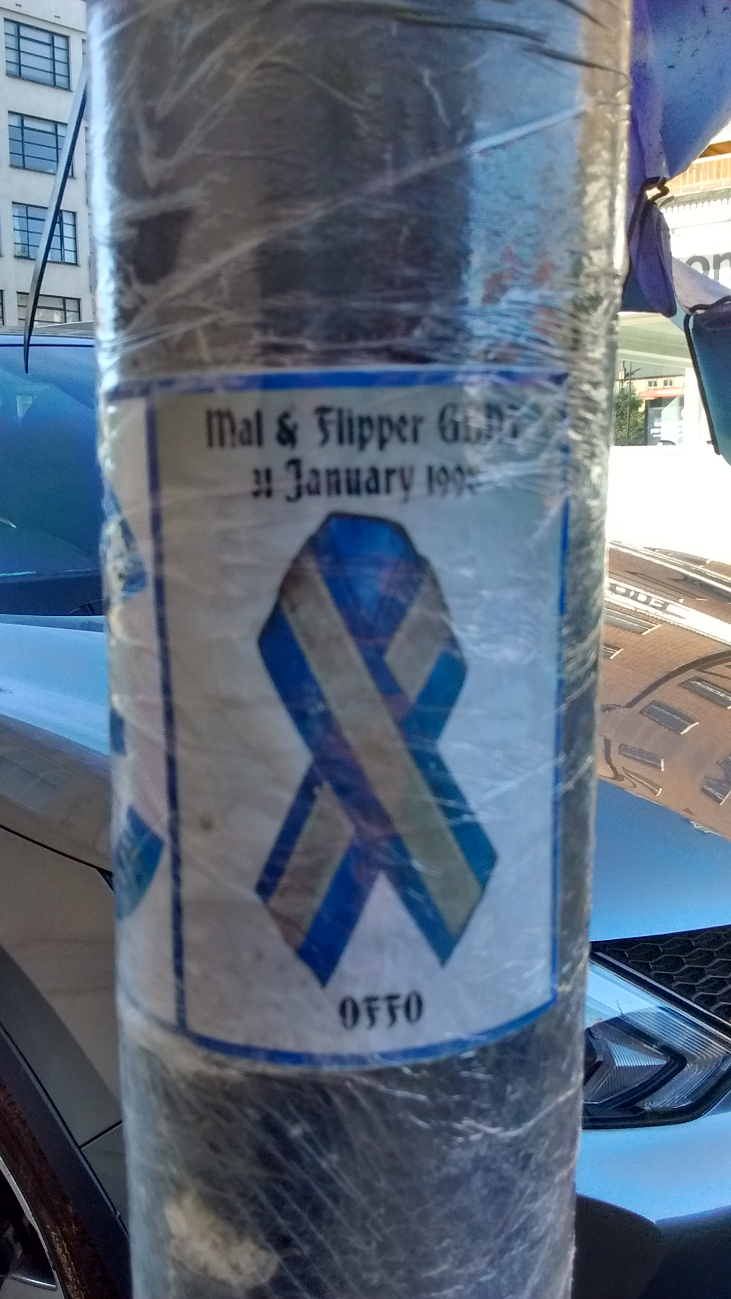 But Mal and Flipper are not forgotten, and last week saw a large group of Outcasts, with an impressive set of motorbikes, assemble early on Saturday morning at Battersea Arts Centre to pay tribute to their fallen comrades. The sign post where Mal died always has several small tributes attached to it, and for a few weeks after the anniversary, like every year, it also has a wreath in their memory.