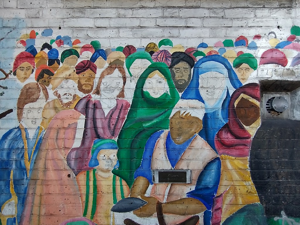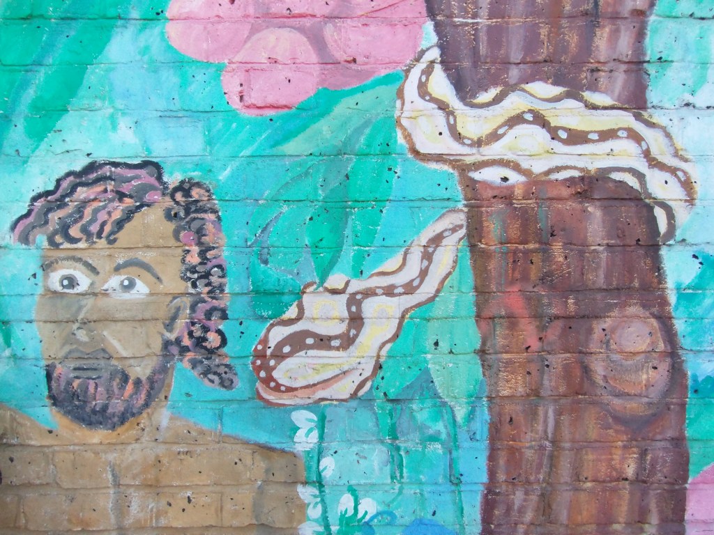 The mural itself is well developed and features a series of key Biblical events – with Adam and Eve (and the serpent) making an appearance in a Garden of Eden that includes a large pink flamingo right at the start, as well as Noah’s Ark and the Crucifixion – although one of the more curious aspects of the current mural is that it seems to never have been quite finished! As our photo below shows, the sketches for some of the faces are still there in pencil.
