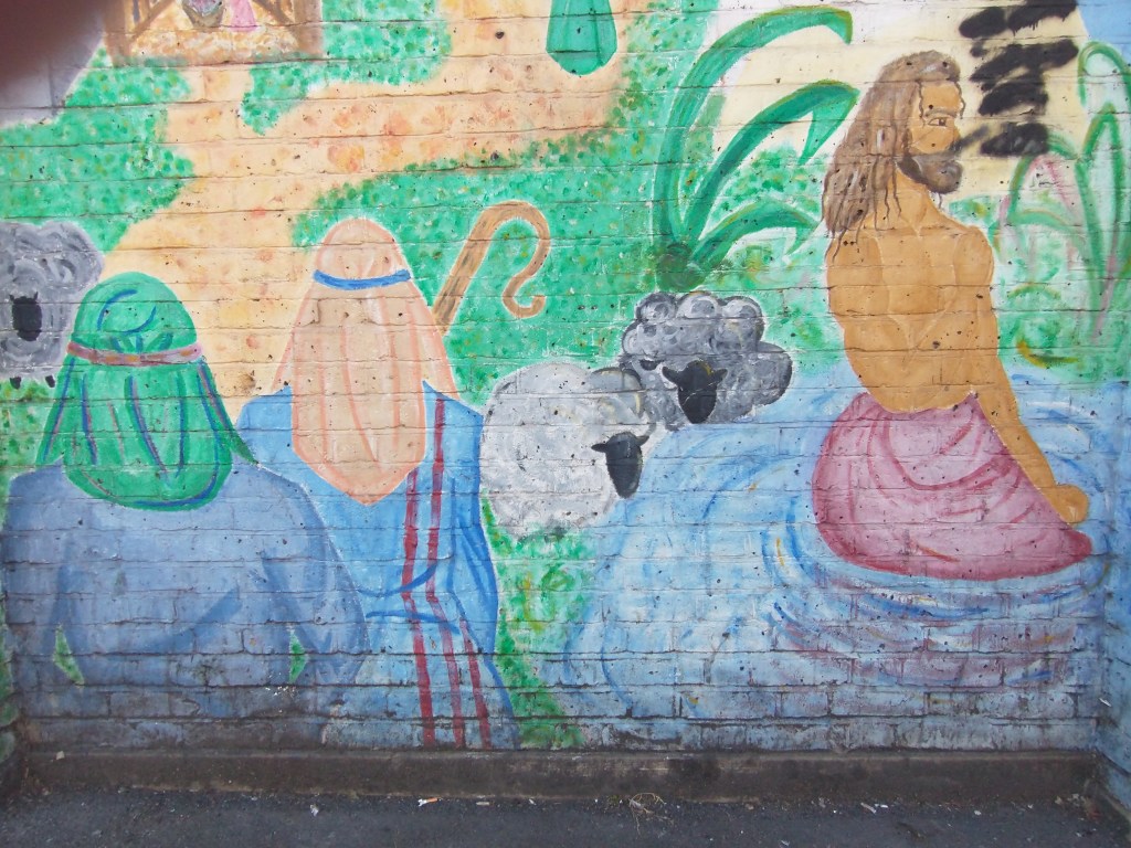 The small plaque visible in the photo above is ‘a gift to those who wait’ from the Church; we’re not sure if it is a reference to the mural itself or maybe also (given the position of the plaque) to a long lost bench. It also looks as though the mural was originally planned to be longer, and run the full length of the building – but the end nearest Tesco has been left as a white undercoat from the beginning (now very much showing the effect of traffic pollution where cars wait for the lights), and could sorely do with a bit more colour and interest.
