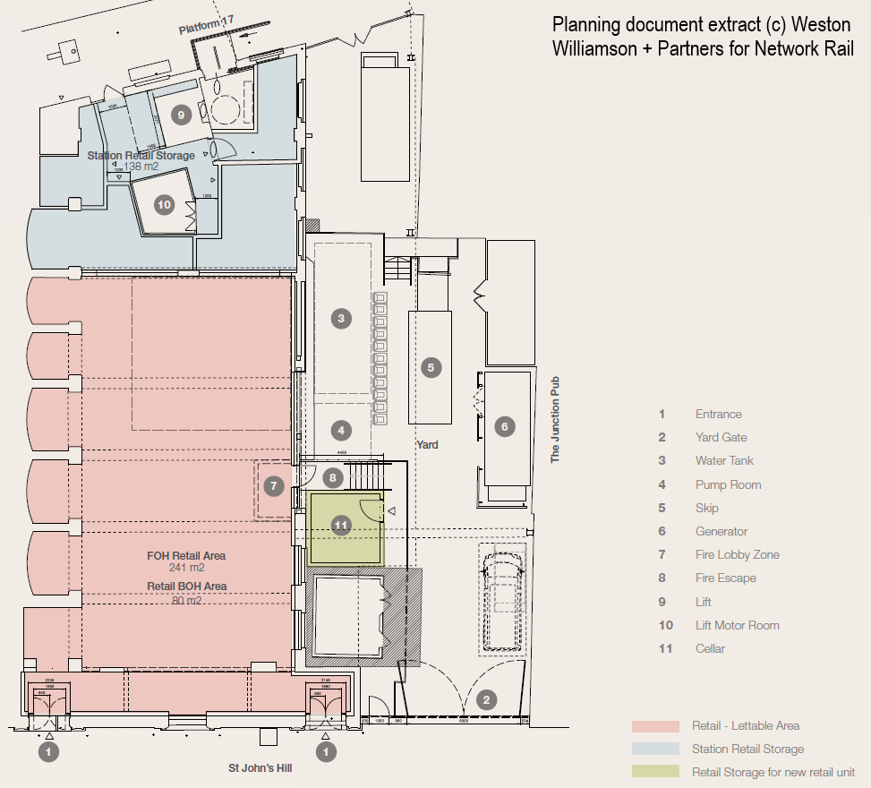 The plans are for about half of the ground floor area to be used as the new pub, with the back section still kept in use as storage of the shops (but organised in a more efficient way to use the space better). There is an open yard next to the pub, which on the face of it could have been a useful outside area for the new pub – but we have to remember that this is also a working railway station, and that area will be kept as part of the back-of-house station area to accommodate odds and sods including an electrical generator, a rubbish compactor, plant, and two electricity substations, space for a large skip, parking for a maintenance van. It’ll nonetheless leave a decent amount of space for the new pub at 3455 square feet, which (as a guide for those less used to square footages) is just a bit bigger than a typical Tesco Metro / Sainsbury’s Local. The diagram below shows the ‘pub’ area, in pink – which includes a whole row of brick alcoves – and the reorganised storage area for the shops in blue.