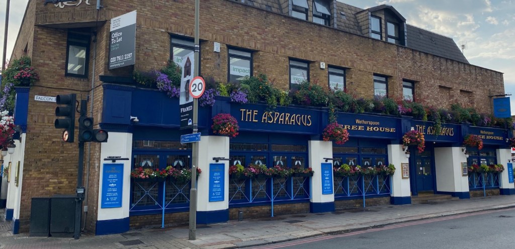 Some time ago we reported on the opening of The London & South Western, Wetherspoons’a newest pub, at the western end of Lavender Hill. It was notable that opening the new pub left Wetherspoon’s with two pubs within a short walk, at either end of the Falcon Road. We wondered about the future of their existing pub, The Aparagus: while both seem quite busy and profitable, the new pub was more central and more typical of the city centre pubs the company has increasingly been developing. Sure enough, about two years later, the Asparagus is for sale, as one of about 40 pubs on the market.