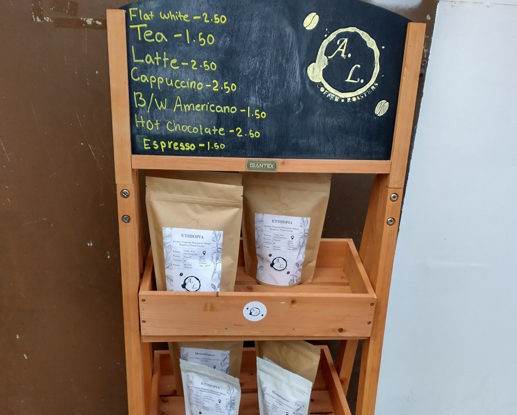 Most of the coffee produced is sold to businesses, but Andres has a proper coffee machine on site and sells various beans, as well as takeaway coffees. It’s an exercise of how to fit a lot of equipment in a small space, with everything just about fitting in to about ten square metres.