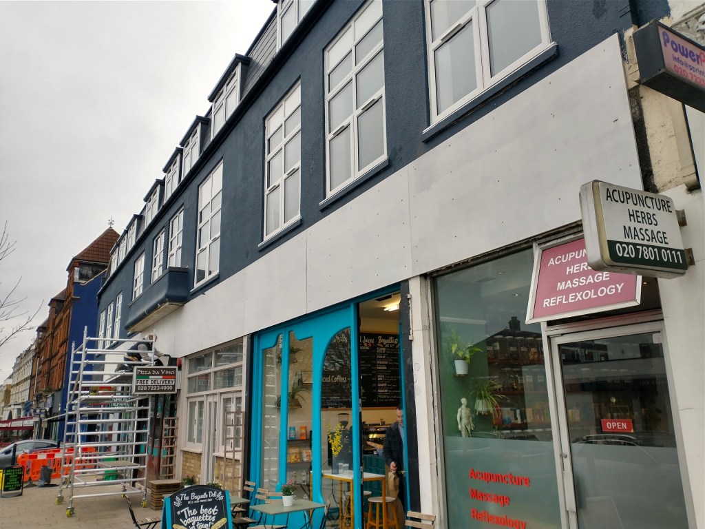 The work has also seen several of the buildings on the site completely re-roofed, and new windows and insulation installed. The signage is being tidied up right along the building to make the shopfronts more consistent with each other. We understand the name of the centre may also change, to be called the Business Village. This investment isn’t quite on the scale that had at some stages been envisaged – we previously reported on plans to build a new building that would have provided an entrance reception with offices above; and at one stage there were also plans to create serviced accommodation on site. However the the improvements to the existing site will be welcome to the traders along this stretch of Lavender Hill, many of whose premises are also part of the centre. These include the still-not-open China Garden takeaway, pictured, which has looked for a few weeks as though it was about to start trading. As scaffolding comes down and we start to see the new look for the Business Centre, it’s good to see the owners investing to keep the centre attractive to tenants, without making it so smart that it loses its core purpose of providing sensibly-priced and practical accommodation to local businesses. And if you are looking for an office or workshop space – details of availability are here.