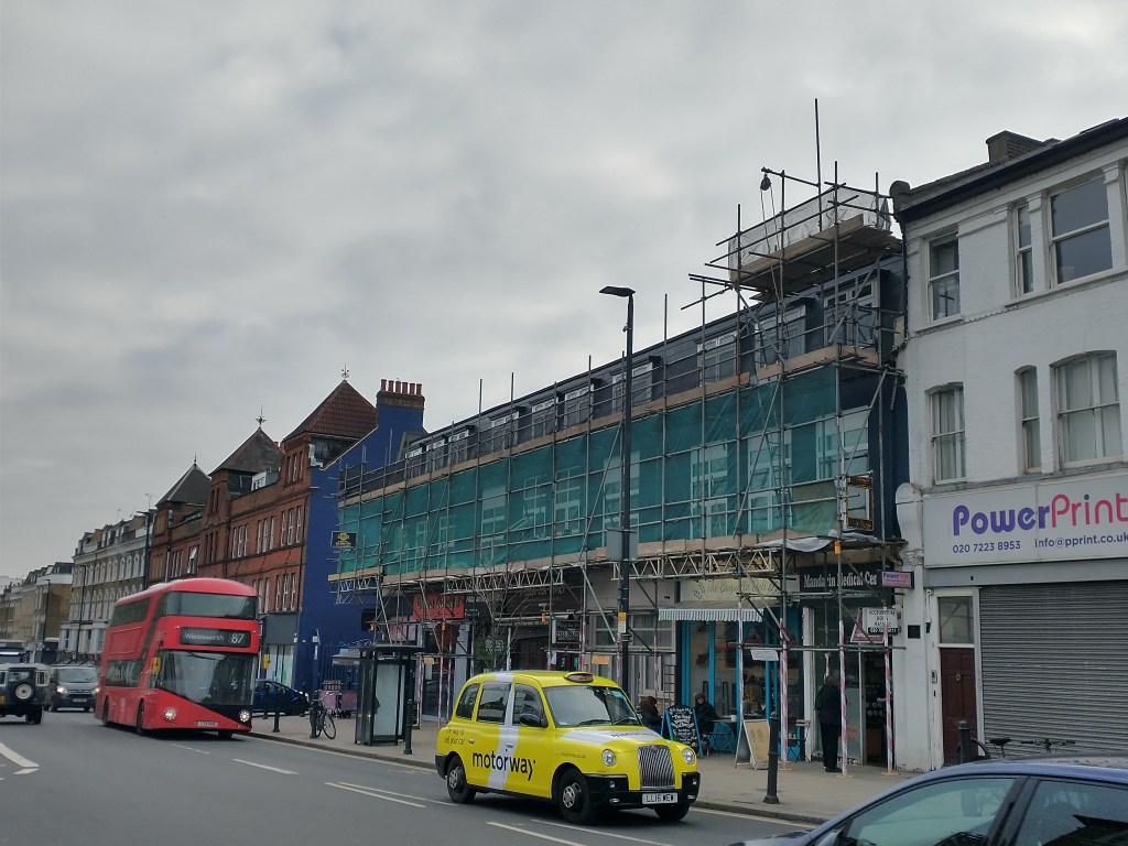 But even a business centre that’s trying not to be too showy and remain focussed on practical businesses needs to keep up with the times, and the rather tatty frontage of the Battersea Business Centre on Lavender Hill wasn’t really doing justice to the place. Mucky white paint, blocked gutters that dripped on to the pavement seating below, and crumbling windows gave an air of general decay. That’s set to change as it has a proper repaint and clean-up, with new windows and roofing, as part of a somewhat overdue refresh and rebranding of the whole site. The most visible change is that the buildings along the frontage have changed from mucky white, to a deep grey-blue that maybe coincidentally matches the branding used by Unit Management, who run this as part of a portfolio of 17 similar centres scattered around south west London.