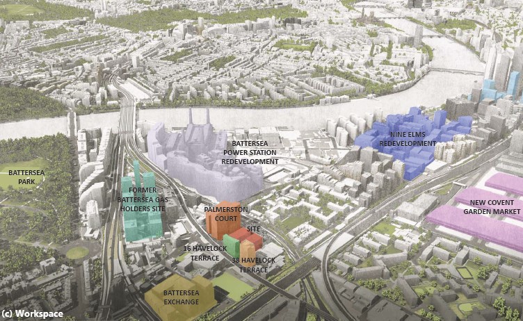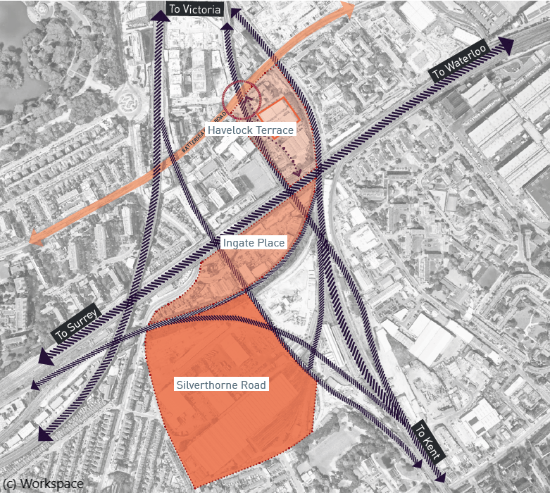This isn’t the first proposal for higher-rise industrial use – maybe because the site is within the Battersea Design and Technology Quarter, an area shown in orange in the map above which is being deliberately developed as a home to business. We’ve written previously about some of the projects underway on the ‘Ingate Place’ part of the site, and two other similar proposals are also being developed in the Havelock terrace area, shown in orange and light green below –