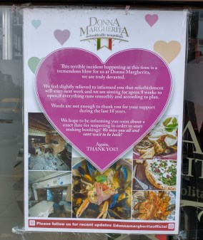 But progress was slow, with lengthy pauses. The first time everything stopped we hoped it was just a case of struggling to find people to do the finishing touches in a very tight market in the building trades. But weeks turned in to months, and we were unable to detect any signs of activity, or contact anyone involved. Back in May this year, over a year after the fire, our post “Donna Margherita: Is this goodbye?” got a fair bit of attention, and if nothing else it showed that there is strong loyalty to a proper neighbourhood restaurant that has been with us for so long. There were clearly still people hoping that the restaurant could return – but the site remained as in the photo above for many more months. Extended closure is a dangerous place to be for any business, with business rates to pay but no income, no matter how understanding the insurers are, and amid the silence many started to wonder if it was all over for Donna Margherita.