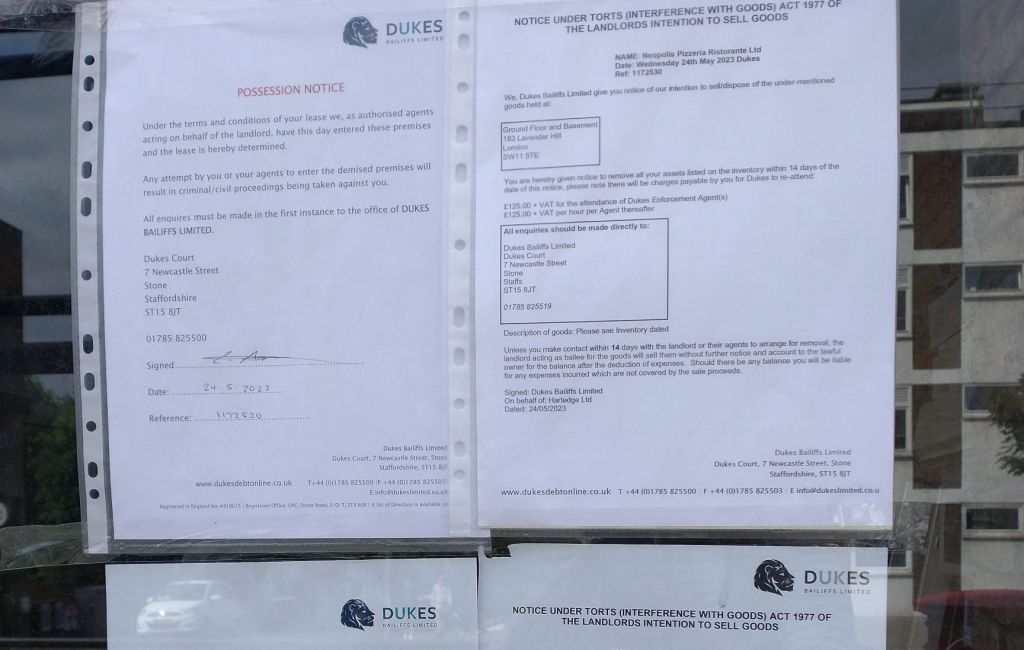 Some time later we reported that work had resumed, and the restaurant was finally finished. Our photo above shows new fridges and delicatessen at the right hand side of the premises, electrics fully finished, the floor polished, seating in place and pictures up on the wall. It had been quite a journey for what the owners initially hoped would be an eight week renovation – but finally Donna Margherita coudl get back to what it could do best, serving good food in a good atmosphere. But in a story that had already had a few twists and turns, yet more bad news: just when the restaurant was ready to reopen, notices from ‘Dukes Bailiffs’ have appeared on the door confirming that the premises has been repossessed by the landlord, presumably on the grounds of unpaid rent.