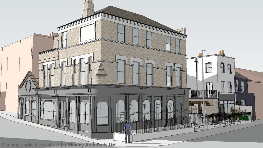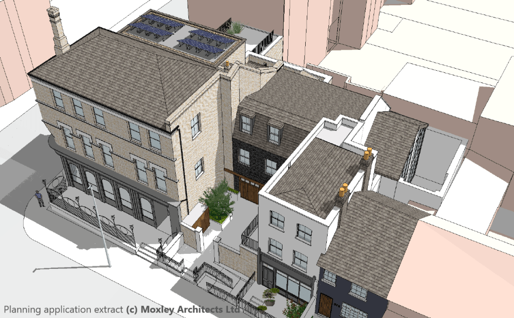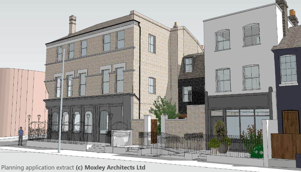 The smaller Lost Society building isn’t remaining as a bar, but will instead be converting to an entirely residential use, creating 9 flats in all spread between the two buildings, with the entrance to all the flats being in what used to be the bar’s garden area. A maybe more surprising part of the proposals, in a conservation area, was that the building was to be completely demolished, and replaced with a similar looking but brand new structure. The planning application reported that the years of rather limited maintenance hadn’t been kind to the building (whose front wall was indeed noticeably cracked), and it was in a rather poor state that made its conversion to anything like modern building standards not cost effective.