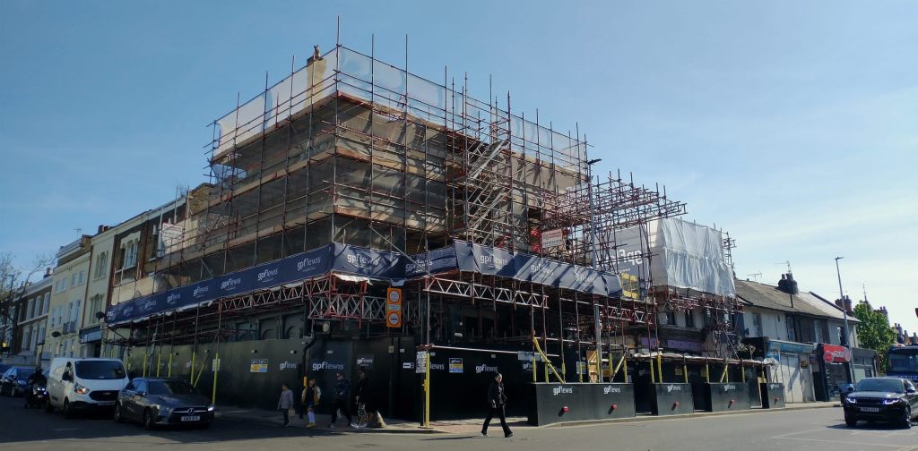It’s now comprehensively covered in scaffolding – with works well underway. The construction work’s pretty substantial – a complete replacement of everything in the building other than the shell and the basic floor structure.