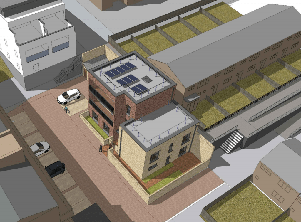 The Council has gone back to the drawing board, and now plans to build something a bit different and rather larger in the same spot. The house is gone, as is the block of three flats: instead, we’re likely to see a single building with five flats. Two of them are on the ground floor – a one-bed flat, and a large four-bed flat, both with small private gardens, and provision for two street trees to be added to make the car parking area a bit less of a concrete wasteland. There are then three duplex flats on the first and second floor (a one-bed, a two-bed and a three-bed), each with a private balcony. This is a substantially larger build than what was previously planned for the site, hence why there are now five properties rather than four (and larger properties too, with a total of 11 bedrooms rather than 7) – but it’s fair to say it is also a cleverer approach, solving quite a few issues that had become apparent with the previous design.