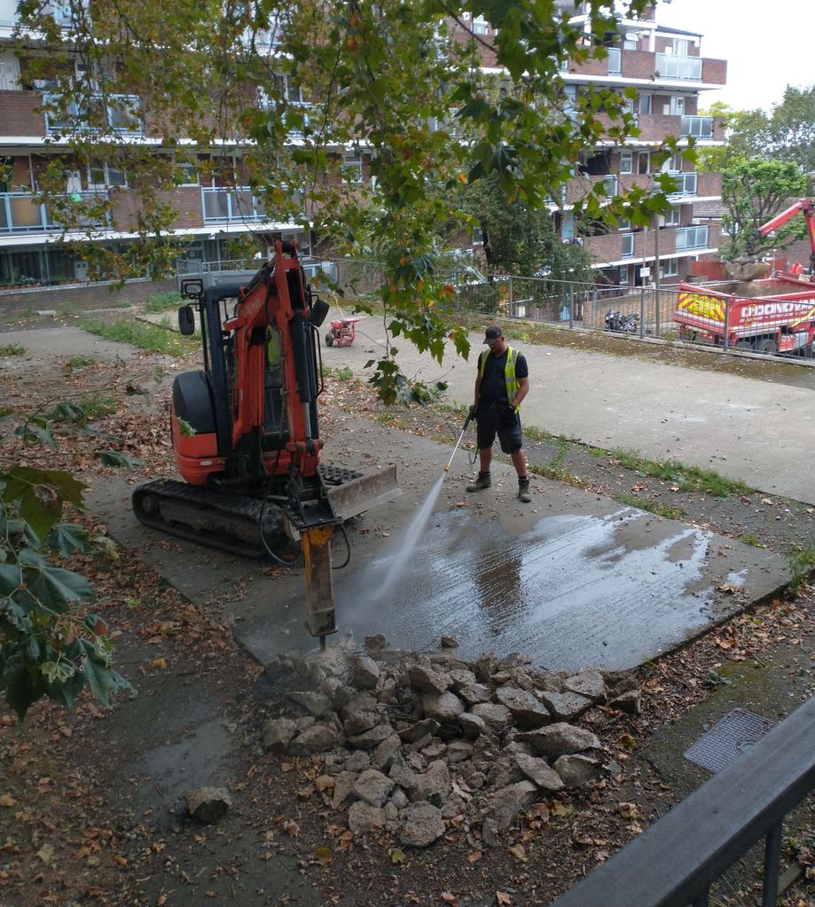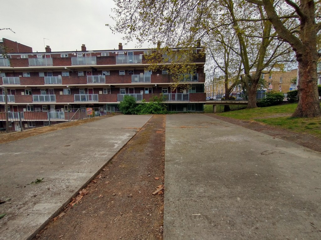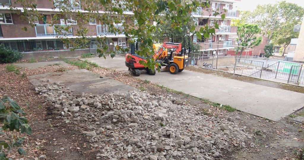 A rather loud day for residents of the Gideon Road estate, as works begin to on a project to improve the estate’s gardens and landscaping. The first stage is the most disruptive, as the large concrete foundations between the blocks are dug up. These used to support a load of rentable storage sheds – which were removed about 15-20 years ago as they were damp and little-used, their roofs were made of asbestos, and the narrow alleyways around them gave cover for all manner of dubious after-dark activities! These areas have been a bit of an eyesore, not to mention a waste of a fairly large area of usable space, ever since.