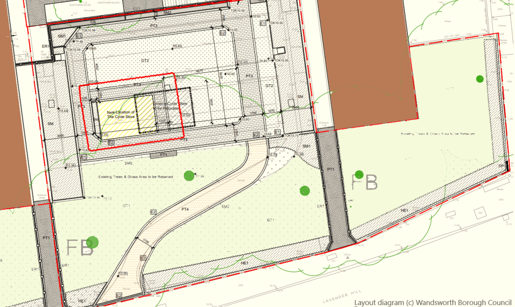 The plan above shows what we can expect for the currently concreted over area between 1-28, and 29-56, which we have shaded in brown. Essentially removing the concrete slabs and converting it to a small grass courtyard surrounded by a new paved pathway and low level planting. We’re lucky to have Wandsworth’s Horticultural Services team involved here, who also look after the Borough’s parks, as they’ve got lots of experience in developing planting schemes that are low maintenance but also likely to provide interest and colour all year round. The footpath that runs from Lavender Hill down to the car park will be realigned to line up with the staircase, moving it a bit further away from the buildings, and will also be repaved with a new surface. The existing London Plane trees will remain in place (and may be a bit happier without huge concrete slabs covering up their roots). One of the foundations was recently adapted as a base for a secure cycle storage shed (pictured above), which has been unbolted during the demolition of the concrete, but which will be reinstalled close to the current location after the works.