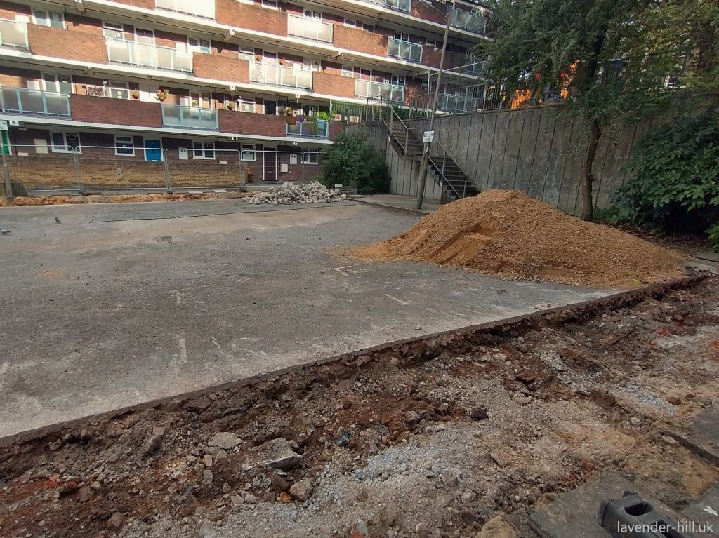 Down the steps to the car park between the same two blocks, work is already underway to dig up the sides of the footpaths, with a small strip of the back of the parking spaces and of the pavement removed and dug out.