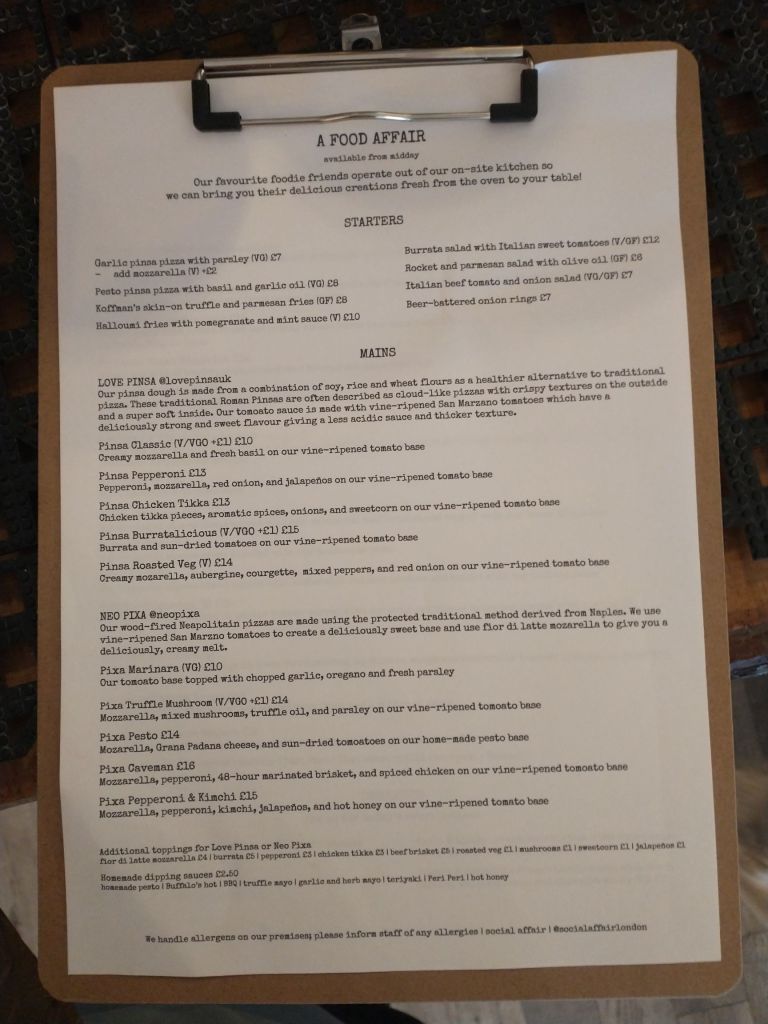 But that’s not all, as 43 Lavender Hill is an unusually large venue and the back of the premises includes a full scale commercial kitchen (which has had a complete refit in the last few weeks) to become home to five different food offerings. These are LovePinsa (described as ‘a cloud-like Pizza’ that has crispy textures on the outside and a super soft and scrumptious inside), Return of the Mac (specialising in Mac & Cheese for grown ups), Organic Butcher (steak & fries), NeoPixa (Neapolitan Pizza), and Wingers (fried chicken & wings). The back of house is a separate business, trading via Deliveroo – but running in a close partnership with Social Affair coffee shop so that they can offer table service in the front of house, as well as an in-person-takeaway offer. Our photo below shows what you can expect from the food menu – available daily from midday.