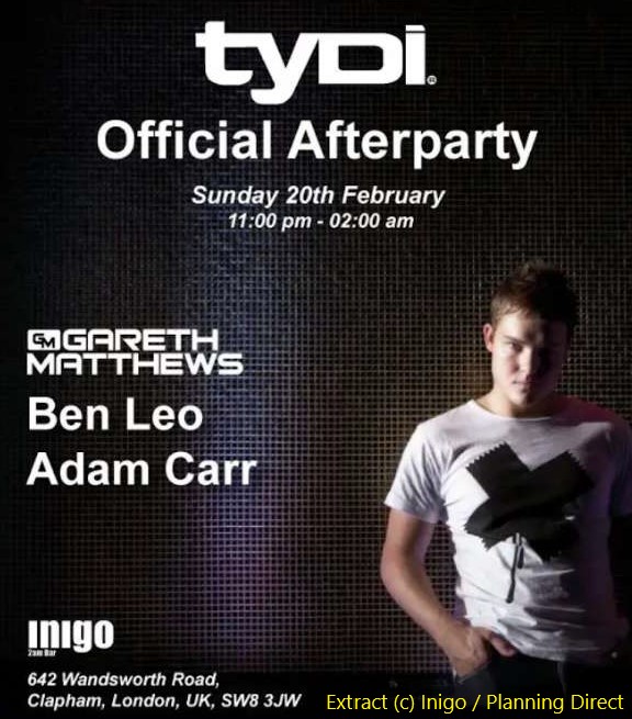 These are quite unusual cases to have to prove! The owner’s team of planning experts have had to go on an interesting journey, moving away from the technicalities of building space standards, local authority development policies and design and access statements to instead dig through the back archives of Resident Advisor‘s club listings – to find evidence of long-forgotten parties! It’s quite an interesting and unusual planning document, being essentially a collation of club flyers – as the planning experts have had to submit an admirably comprehensive bundle of evidence that the place has run as a club from 2012 to 2023 – like the one pictured, a TyDi-headlined event at Inigo from 2012. They did also supply lots of evidence of licensing of the venue (including that tell-tale ‘provision of facilities for dancing’ bit), as well as evidence of building control checks over the years.