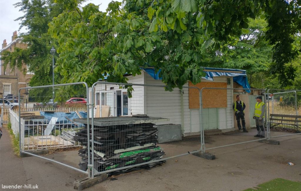 Meanwhile closer to Clapham South the Bowling Green Cafe, which has been the subject of much more controversy linked to plans to convert the whole site to a Minigolf facility, is also seeing works. This building is a rather more fragile structure in the first place than the forest toilet building, and is in a similarly dreadful condition; for some time it has been too unstable to have customers inside. The team on site were doing their best to repair the roof, and we understand it is also being refurbished to be leased out as a cafe