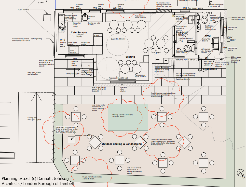But the newly-enthusiastic Lambeth went further. Probably with half an eye on the huge volumes of trade that the other two upgraded-and-extended cafes on the Common are now doing, and the proximity to the busy but café-less playground at the Battersea corner of the Common, they saw the potential for income. The Clapham Common Management Advisory Committee have reported that rather than leasing it out, Lambeth is considering operating the cafe themselves. The planning application makes a slightly different suggestion that the Cafe will be operated by a private tenant under a lease agreement with the Council.