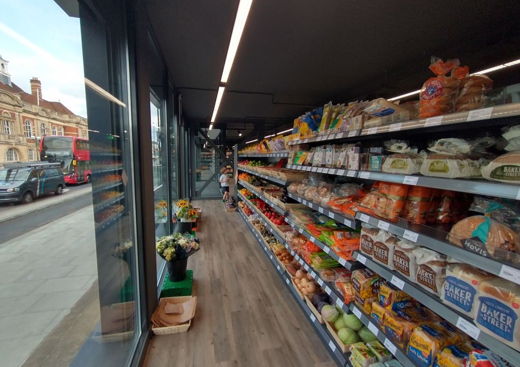 There’s been a pretty comprehensive refit since to create an impressively clean and smartly presented store. The ceiling is dark grey – which is a shopfitter’s classic approach – a relatively cheap but pretty effective way of making somewhere look smart and hiding the operational infrastructure it takes to run a modern grocers’ in plain sight. There was also work to install a refrigeration plant to service the store, much of which has been accommodated in a basement lightwell next to the premises.
