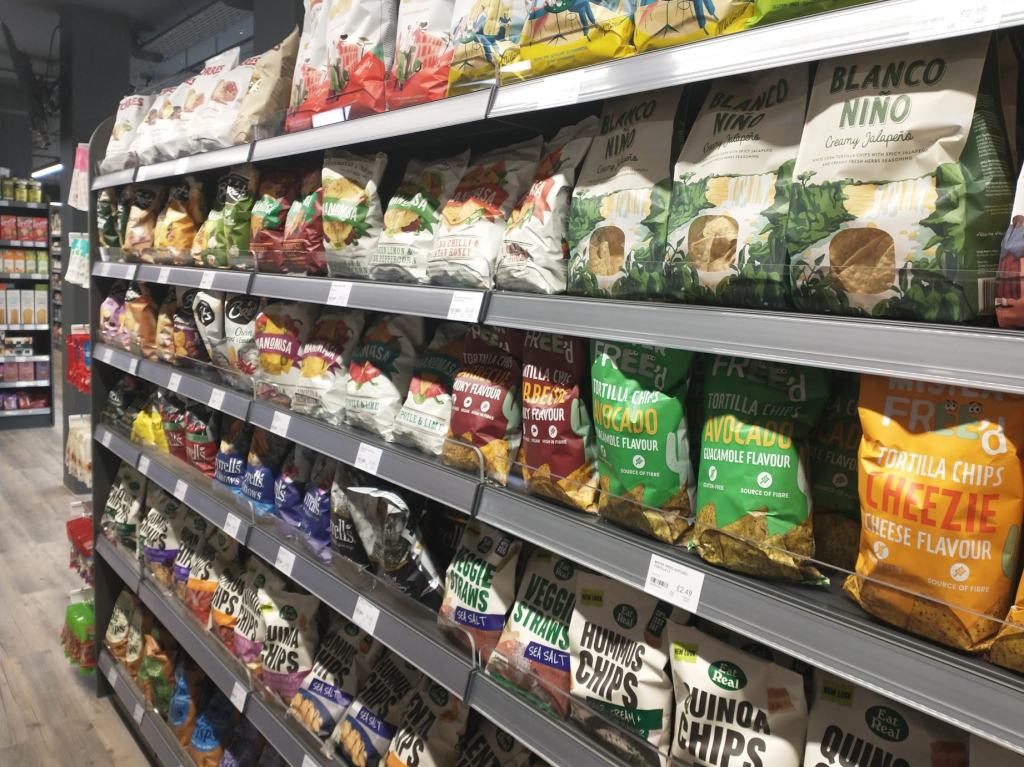 On the ‘interesting crisp based snacks’ front, you can expect to find the whole of the Tyrrells and Manomasa ranges, as well as Quinoa chips, Mister Free’d, and half a dozen other ranges.