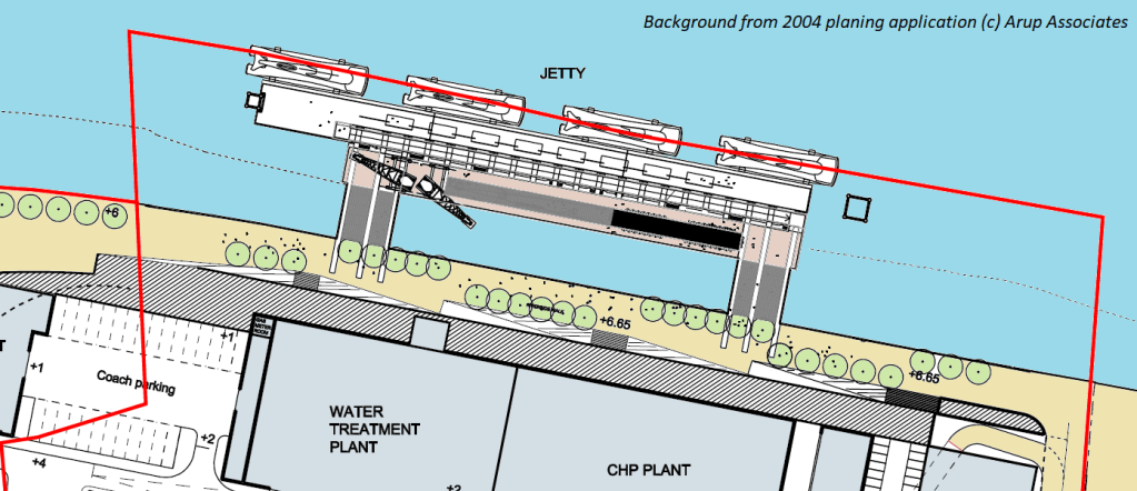 Under these plans the jetty would serve different purposes during different phases of the development. Its eventual purpose would be to serve as a passenger facility for a riverbus service and as a form of extension to the riverside path, and also as a facility for fuel delivery by river to the energy centre. In the interim, it would function as a muck away and materials delivery point for barges to facilitate the use of the river for construction and thereby relieve pressure on the road network (our photo below shows it in action, with the conveyor built to the pier). A temporary pier would be constructed to the west of the jetty, to accommodate a riverbus service until the jetty was no longer needed for construction purposes and the works to develop the jetty for its final purpose were complete. At that stage, the riverbus service would transfer to the new jetty facility and the temporary pier would be removed.