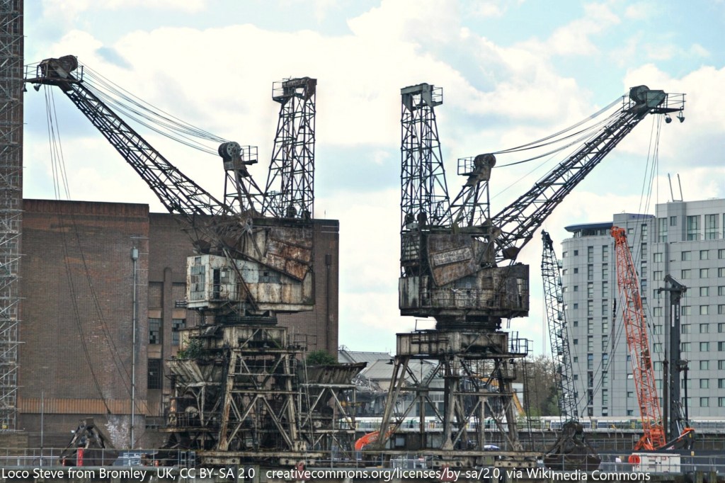 There’s just one small problem – which is that Battersea’s big cranes aren’t currently at Battersea. Worse – there’s a bit of a mystery about their current whereabouts. In 2014, both cranes were temporarily dismantled and removed from the jetty by the developers of Battersea Power Station. This was part of the linked project to extend the Northern Line to Battersea – the idea was that the earth dug out from three kilometres of new tube tunnels & stations (as well as works on the Battersea site) would be taken out to the pier on a modern conveyor belt system, and put in to a barge – and then floated off to Goshems Farm in East Tilbury in the Thames estuary where it was used to cover over an area of poor quality, polluted land and create new farmland. A clever reuse of the pier, and also an ingenious way of avoiding many thousands of lorry journeys through central London.