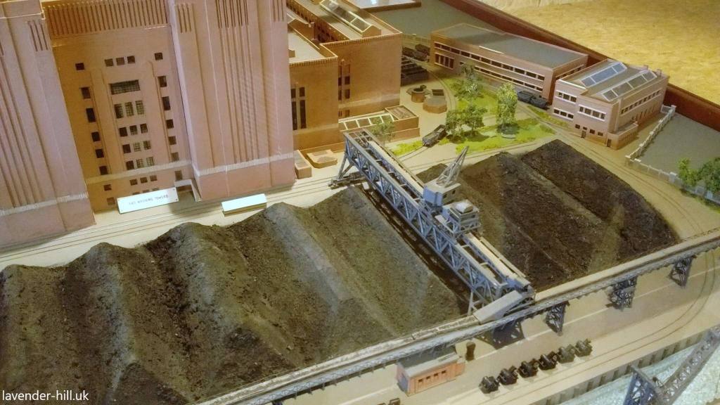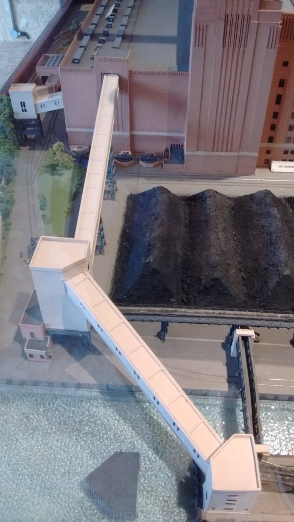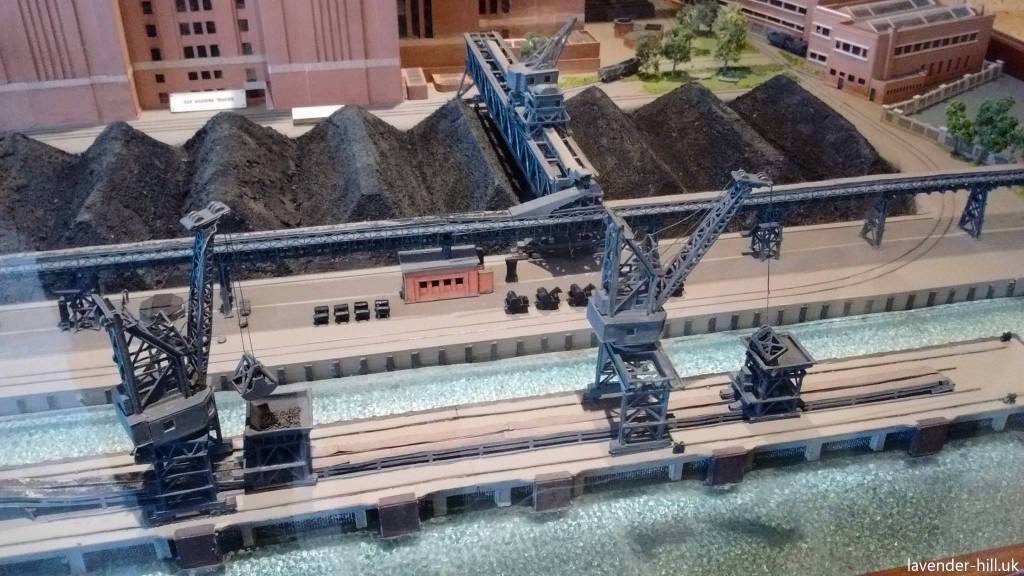 Our photos here are of a model of the power station from when it was still running, and show how these two cranes worked. Barges full of coal would moor up next to the jetty, the cranes would lower great big scoops in to them and lift coal out of the barges, and then drop it on to a pair of hoppers (also on rails) which then transferred coal to a conveyor that ran along the jetty, and – via a series more conveyors and another giant travelling crane – sent it to either a large store in the area between the power station and the river (where the park is now but which would have been a series of big hills of coal) or up to the power station boilers. The cranes were hugely powerful, and carried on unloading up to 240 tonnes of coal hour into the power station until it closed for good in 1983.