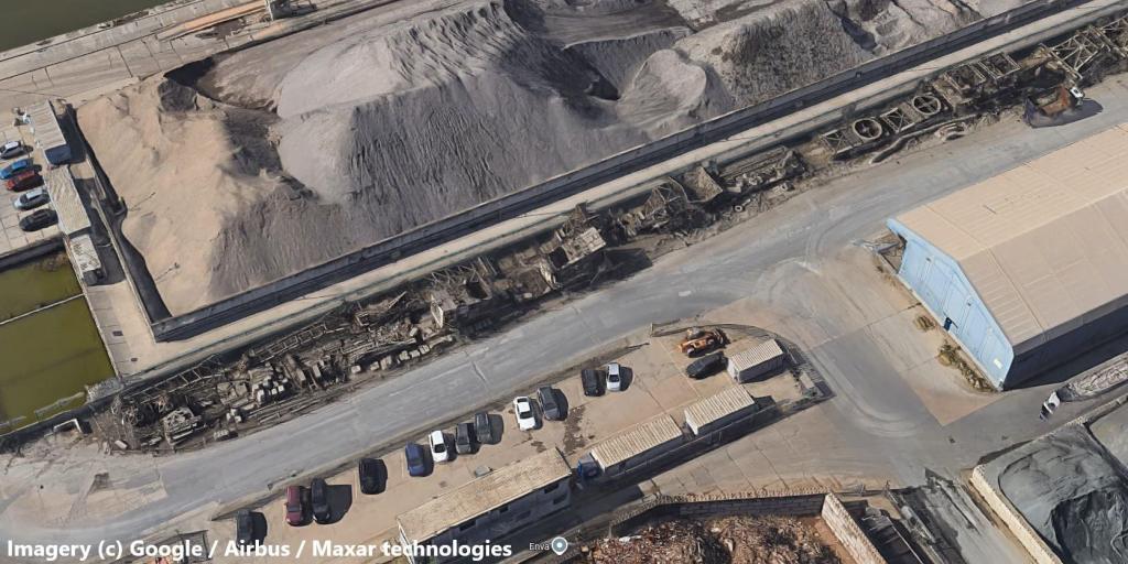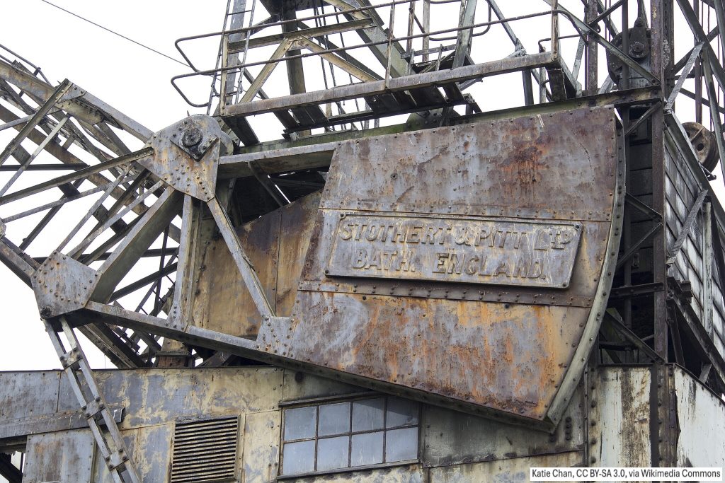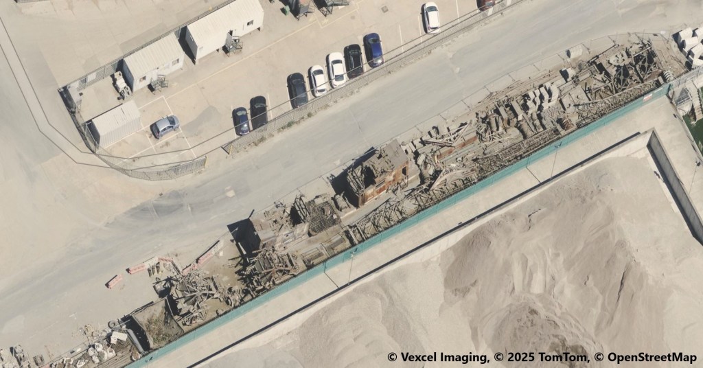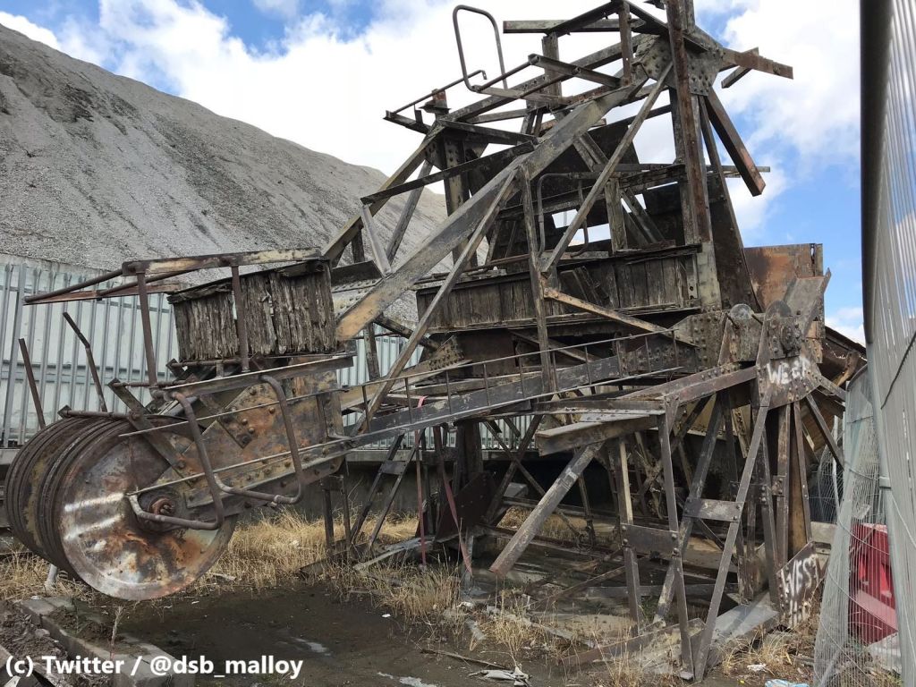 Some might say it looks more like the cranes have been there for a decade mouldering away – without any restoration at all! The actual location of that storage is here – they are, at the time of writing, visible in the current Google maps aerial photo view, along the side of the gravel storage heap.