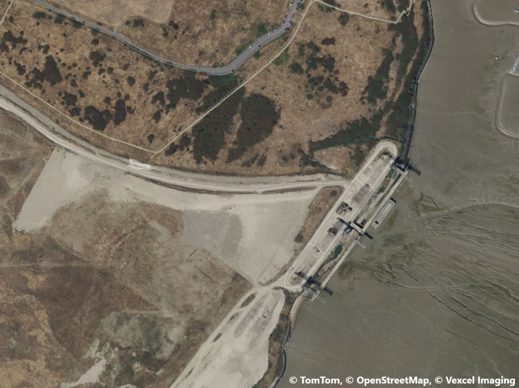The unusual design of the cranes helps too, because there aren’t many of those cranes left either. We’ve pinned it down to an abandoned landfill (maps link) at Mucking Marsh, way down the Thames. Not many people have ever heard of this and even fewer have been there, but many of us have contributed to it because it’s the site where millions of tonnes of London’s rubbish got dumped over the years – this was one of the largest landfills in western Europe. The aerial photo below shows the spot.