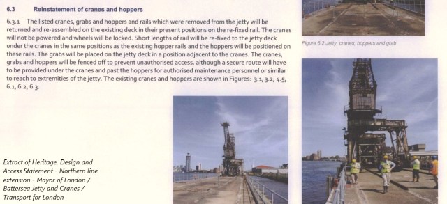 There was a second, rather similar, application made a couple of years after the main big one for Battersea project – but this one wasn’t by the developers, but by the Mayor of London & Transport for London. This one (case 2013/3009) sought permission for ‘the repair, restoration and installation of structures on, and other works to, a jetty in association with its temporary use to provide a river transport facility for the exportation of excavated materials in connection with the Northern Line Extension project, including the temporary relocation of cranes and hoppers, refurbishment works to the footprint, […] and subsequent restoration of the cranes, hoppers and associated structures and bridge links to the land.‘.