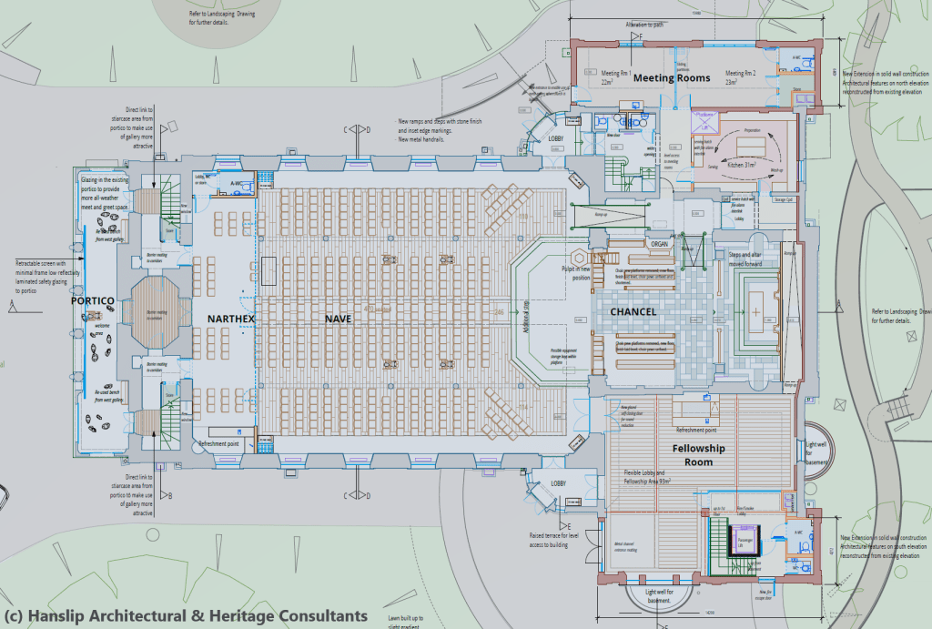 It’s a big and ambitious project. The church’s congregation has grown significantly over the last decade to over 700 people on a Sunday, and these works will help the building handle the needs of these much larger crowds. The church already has many calendar clashes in accommodating the various groups, courses and meetings that are part fo running a modern church, and has to use other spaces away from the church for the children’s groups that support Sunday services. The new meeting spaces in the extensions will be able to host all these at the main building, alongside the main services.