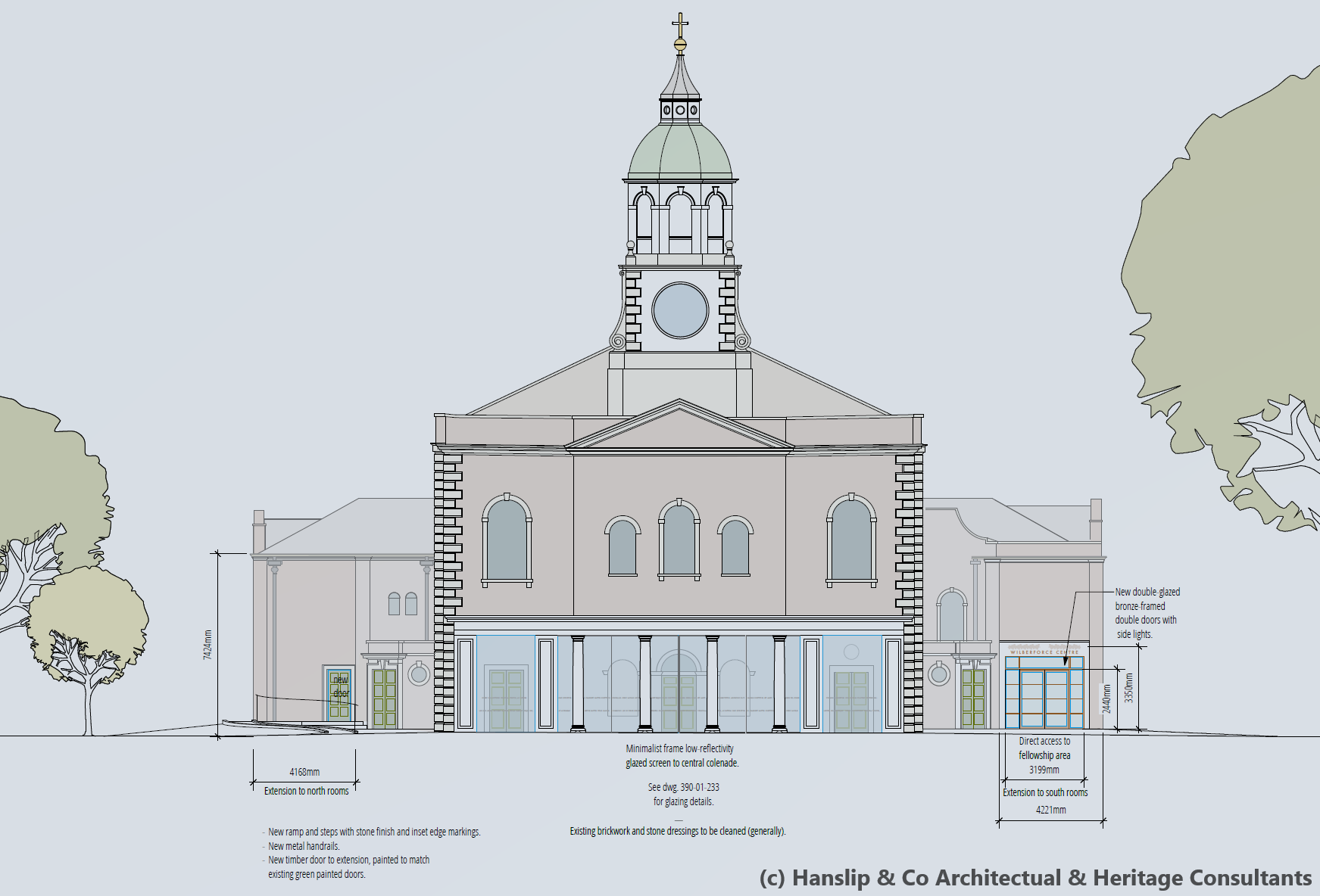 The original plans involved demolishing the portico, and rebuilding an extended version of it, which would have changed the overall proportion and appearance of the church quite significantly. This led to quite a lot of concerns – so the plans were revised to keep the portico much the same size as it is, but close off the entrances with glass (shown in the planning diagram below). This still proved controversial – so the plans were then revised a second time to make no changes to the front of the building.