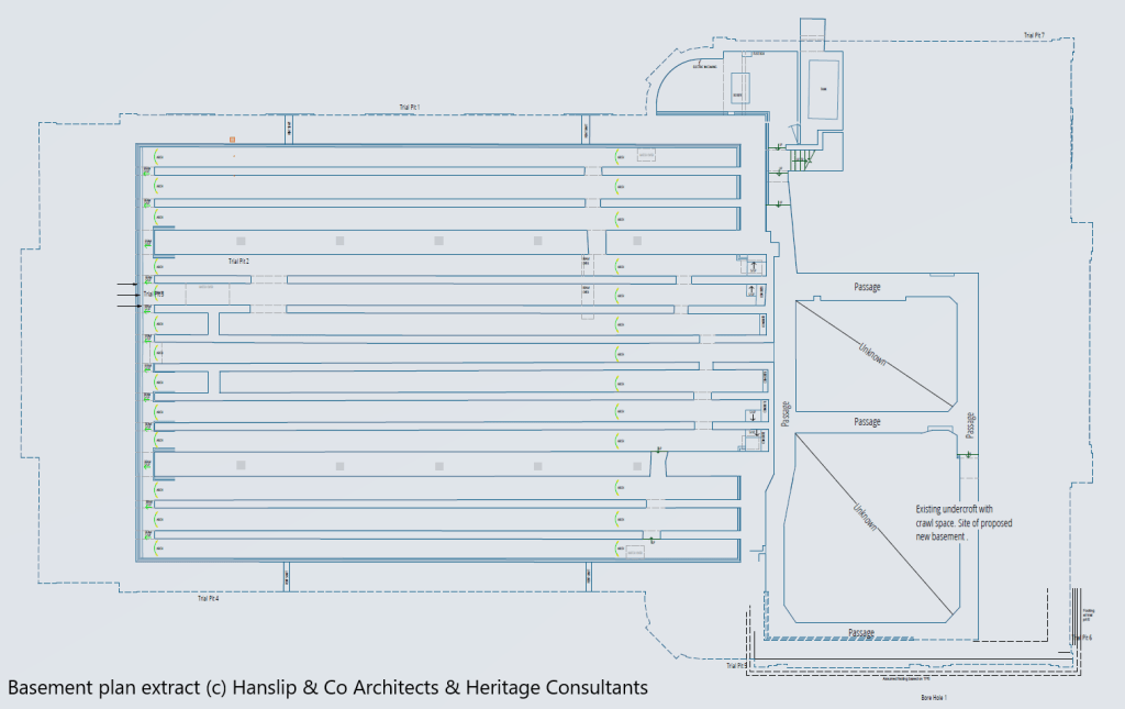 Now having mentioned the new lift to ‘the basement’ – there’s not currently a basement in the church! Just a series of narrow arched vaults and passageways, with a couple of larger crawl spaces at the south east corner of the building – as shown in the basement floorplan below. As part of the extension work, some of the baement is being excavated and turned in to usable space.