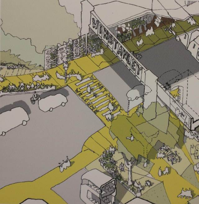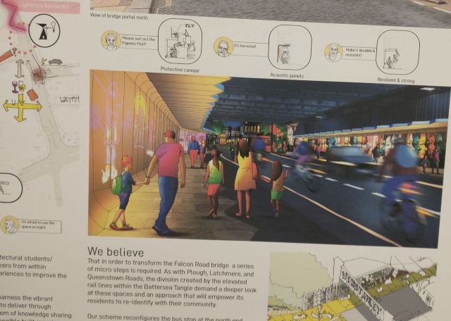 Falcon Road probably sees as many pedestrians as these other bridges added together, and has been on the Wandsworth ‘to do’ list for ages – so we were pleased to see things finally get moving. It started, as the more ambitious makeovers tend to, with a design competition, which saw seven proposals shortlisted. These were exhibited, and it was interesting to see both the wide range of approaches taken, and the variation in the extent to which the entries took account of the actual site. Some were led by very local teams who clearly knew the opportunities and headaches of the bridge in detail – like the need to deal with the big ugly cable ducts and the awkward scraps of land either side – while others were clearly a bit more conceptual. There was also a vote on which should be taken forward. The vote was only advisory: the final decision was made by a n expert panel – as in choosing the design team for the project they also needed to take account of various less obvious factors like cost, practicality and technical deliverability.