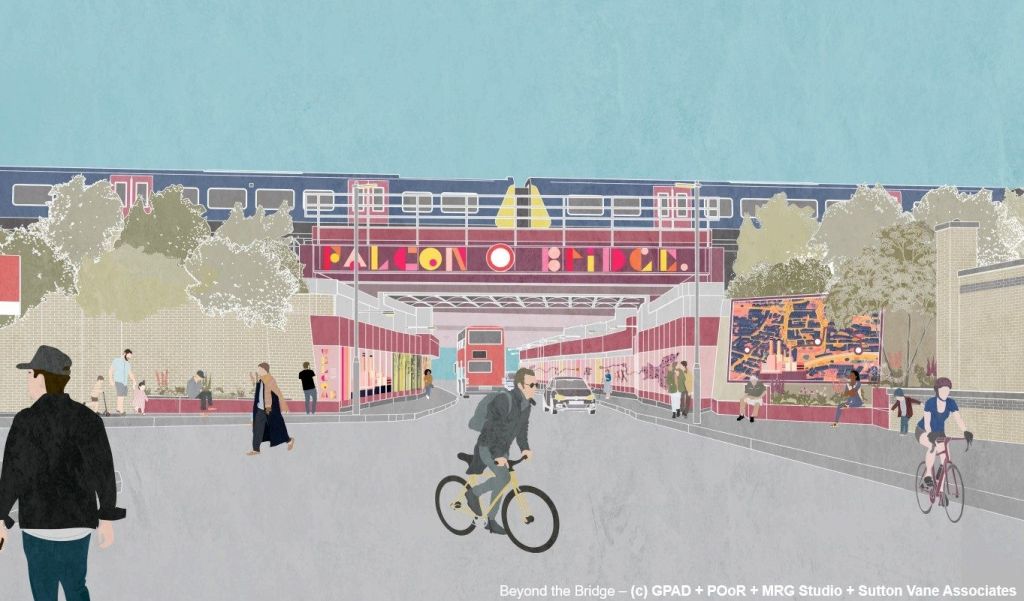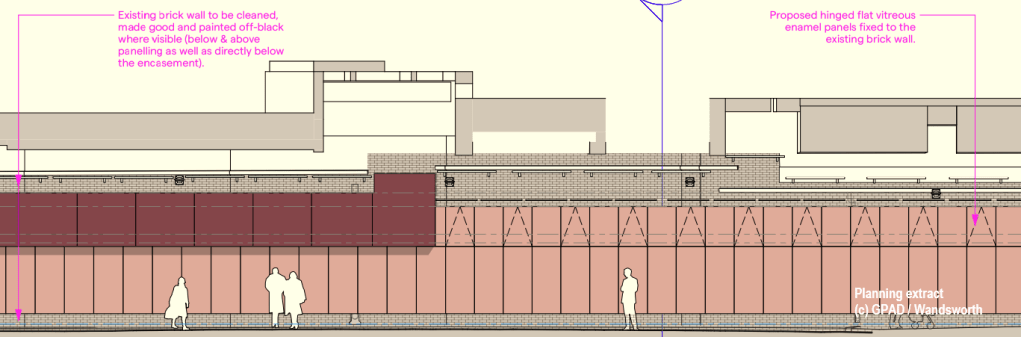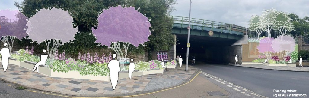 Proposed features included a Memories of Wandsworth wall of local stories and artwork (mainly on panels attached in front of the existing glazed wall bricks), new seating areas at either end of the bridge with pollinator-friendly plants, smart lighting all the way through that can change colour for different occasions and events, and sound-absorbing panels to reduce noise under the bridge.