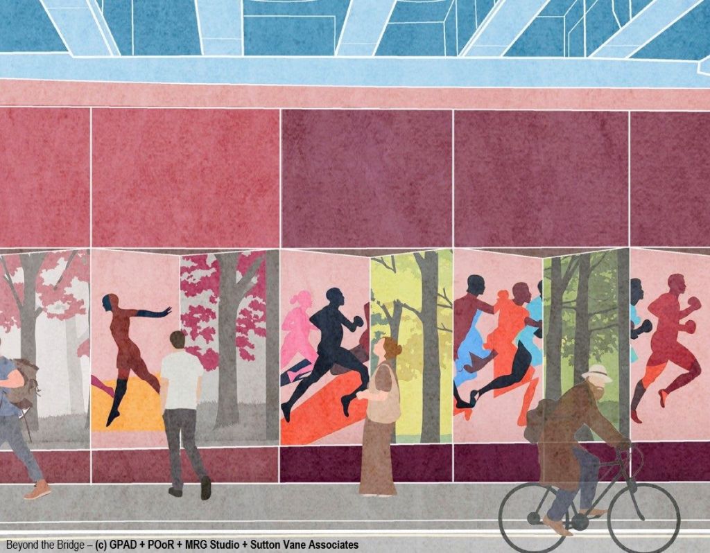 The Panel chose Beyond the Bridge, presented by design team of GPAD (a Hackney-based architecture & interior design practice), POoR Collective, MRG Studio, Sutton Vane Associates, Cundall, and MDA Consulting – the headline image from their design is shown below.