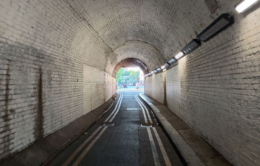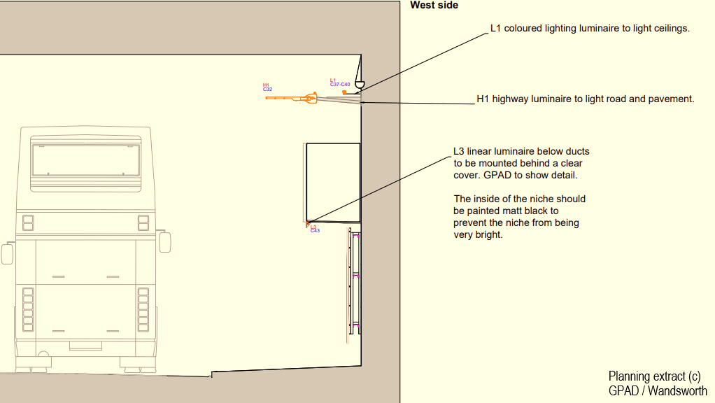 These changes needed planning permission – so Wandsworth submitted a proposal for “Alterations including installation of panelling system to tunnel walls, illuminated signage on north and south elevations of bridge, highway and creative lighting and landscaping and seating on southern side of the tunnel“. It’ didn’t prove particularly controversial; the only comment at the time of writing is from the Battersea Society who support the plans – in particular the work to divert rain away from the pavements, to use panels to create a cleaner and dryer surface on the walls, and to tidy up the green spaces at each end of the tunnel – while expressing concerns on whether some aspects of the proposal will be easy to maintain to an adequate standard, and mild surprise that what is actually going to go on the panels remains a mystery at this stage.