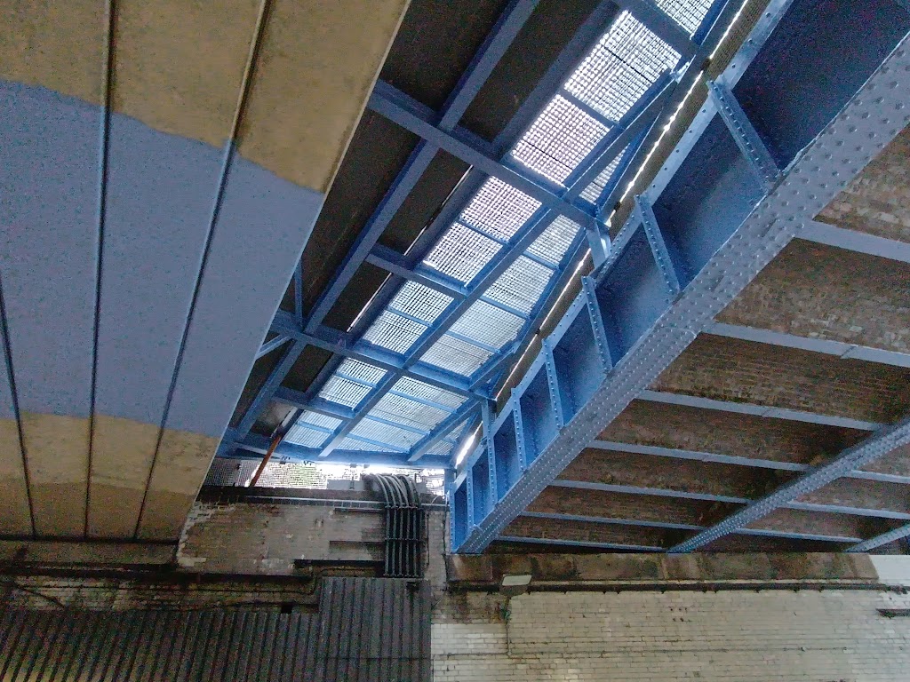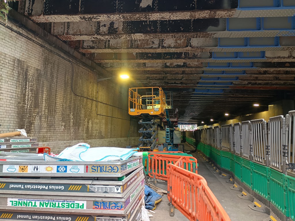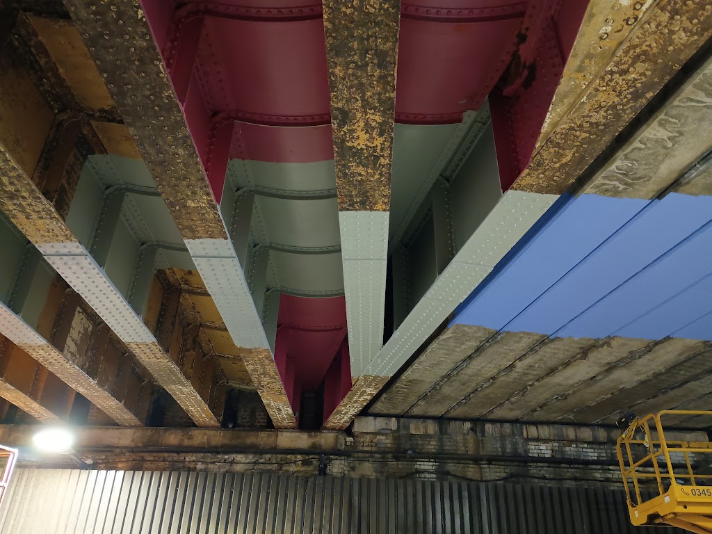 The photo above shows the pink sections that were painted in the previous effort to improve the underpass in the mid-2000s (which was accompanied by localised coloured lighting, until it got removed to make way for Network Rail’s new signal cables) as well as the new grey undercoat on the steel sections, and the final blue paint on the concrete sections. Some sections were also previously painted orange as visible in the photo below.