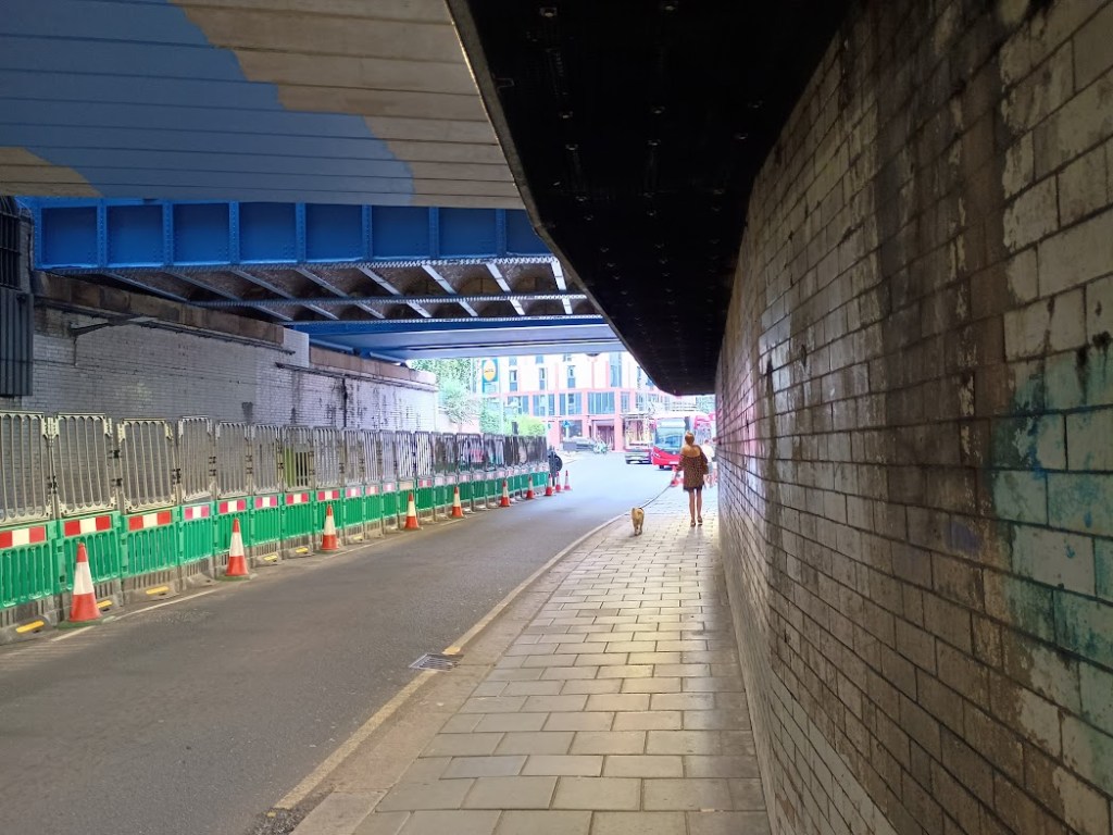 Like a lot of Network Rail’s bridges, these are a prime target for graffiti – we’re hoping that some sort of grill is also installed inside the railing, to make it harder for taggers to reach through or over the parapets and vandalise the newly painted surfaces. Because with schemes like this one, what is actually one sometimes matters less than how it is maintained in the future. The design needs to take quite careful account of how the design can resist future graffiti, pigeons, dirt, leaks and general muck without needing expensive follow up work, and the Council needs to have a cleaning process that keeps a reasonable eye on it. Network Rail – who own the bridge – apparently declined to do any repair work on the leaky tunnel roof, meaning there’s obviously a risk that all the planned improvements quickly become dirty and spoil the impact of the new lighting. The issue of pigeons on the ledges remains a bit TBC – hopefully something can be fitted that prevents them perching all day above the pavement.